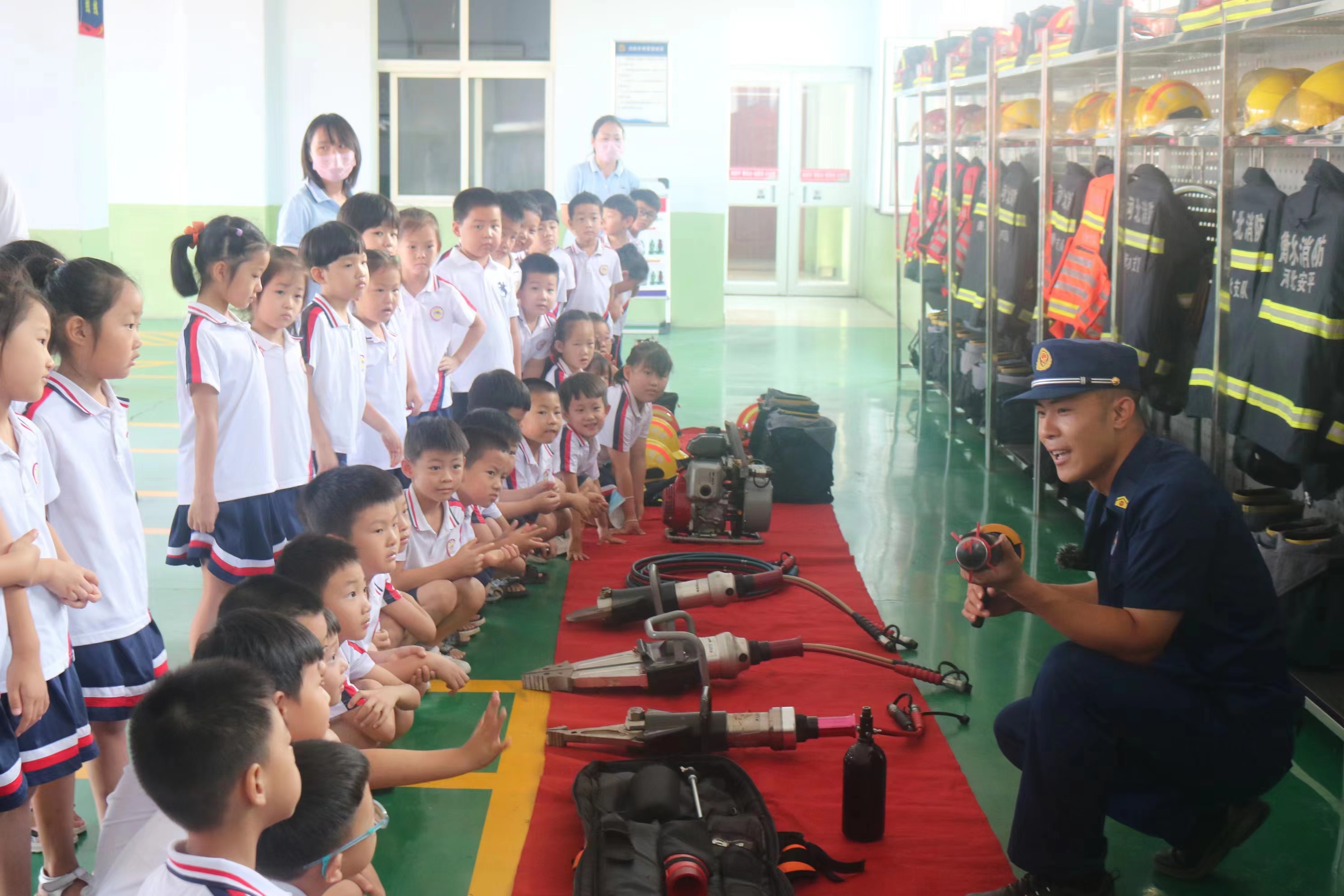 在参观过程中,消防员穿插讲解了日常用火、用电、游泳等安全常识和自救方法,在孩子们心里种下安全的种子。