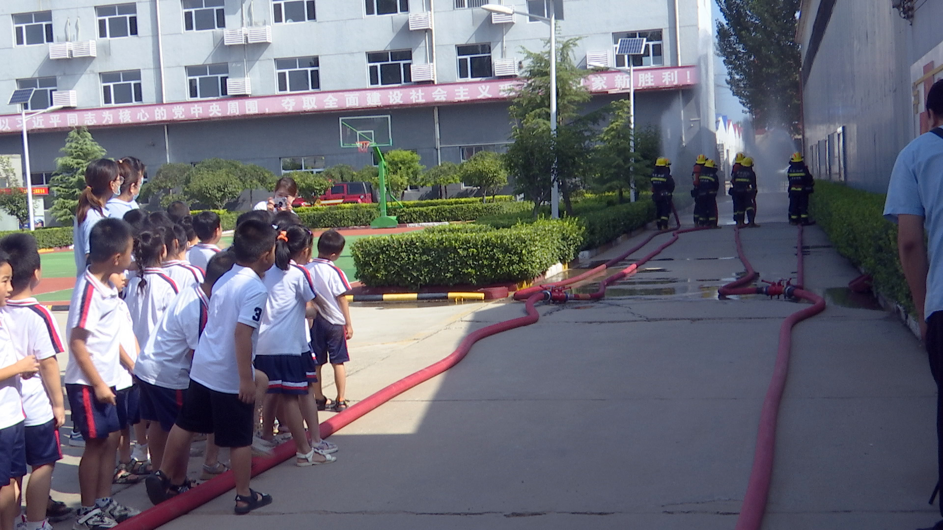 师生观看消防演练。谢朝华 摄