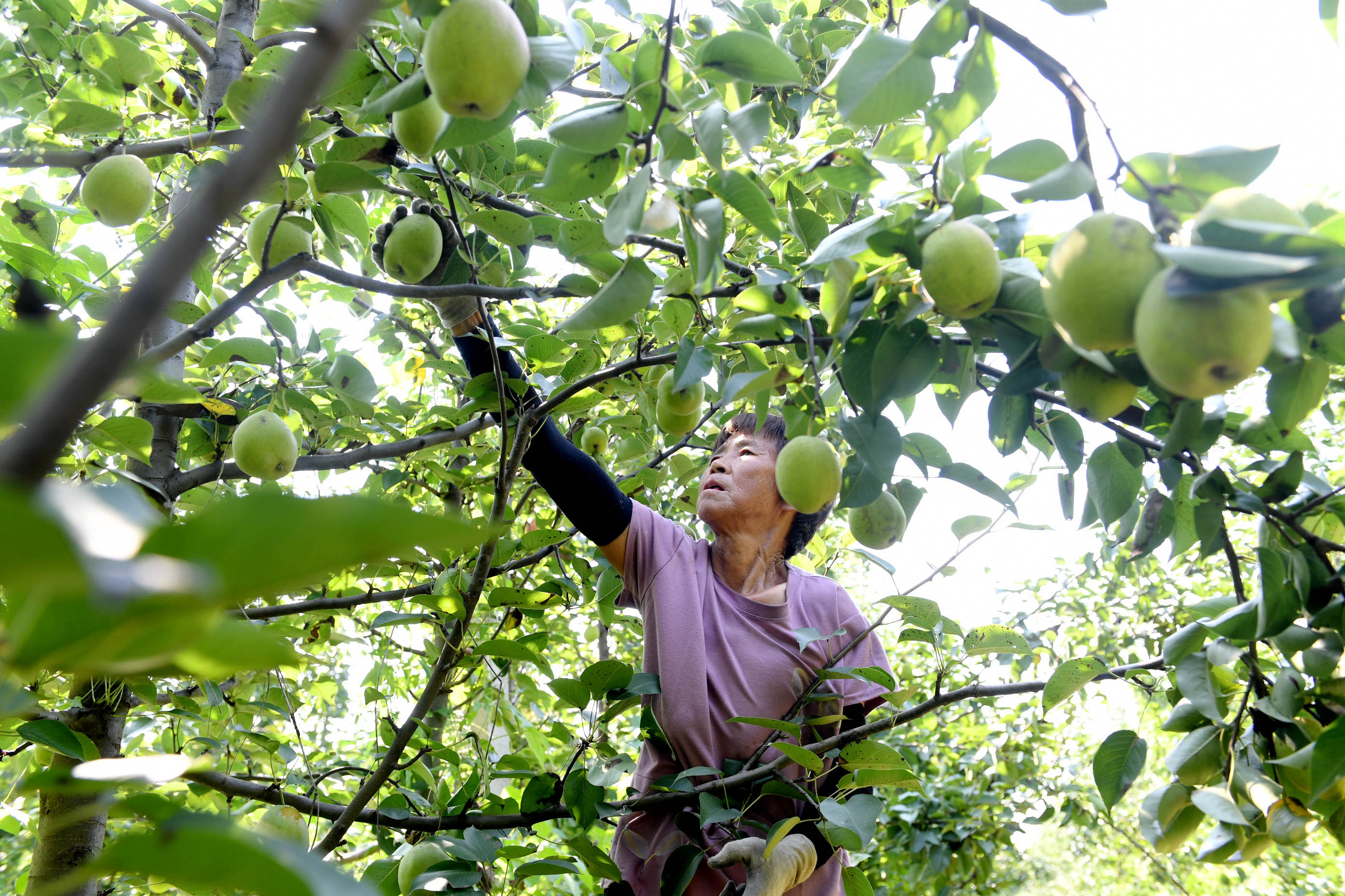 8月17日,阜城县阜城镇冯塔头村的千亩梨园里,饱满的果实挂满枝头,一片喜悦的丰收景象。