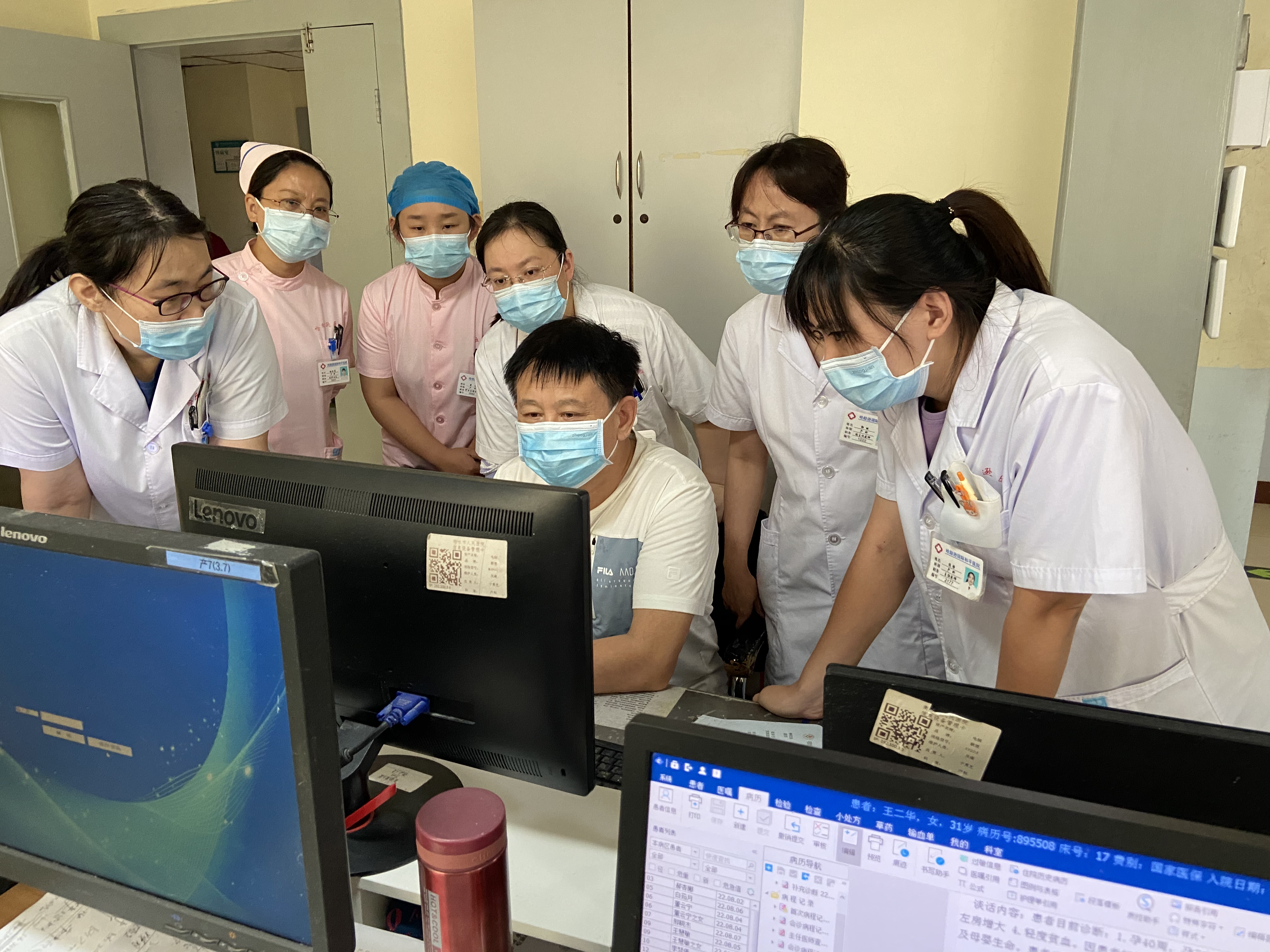 羡海英(左一)在了解患者术后情况。