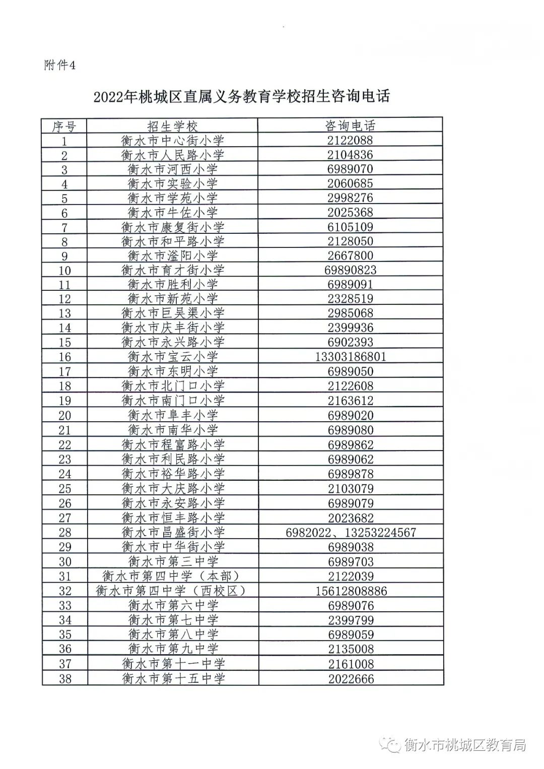 附件4:2022年桃城区直属义务教育学校招生咨询电话
