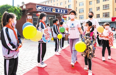 8月30日,内蒙古自治区呼和浩特市玉泉区南柴火市街小学的师生们在欢迎一年级新生入校。通讯员 丁根厚 摄