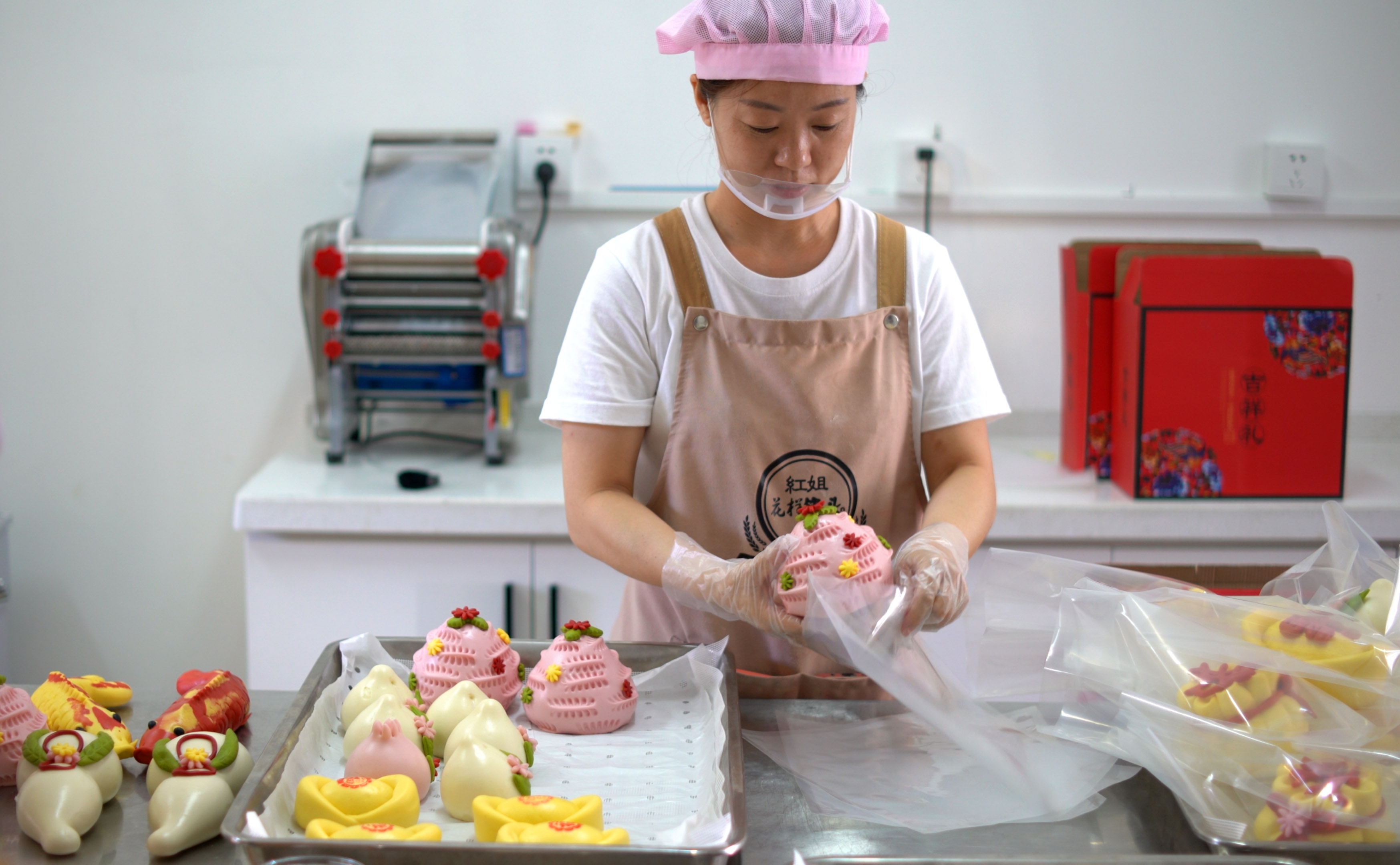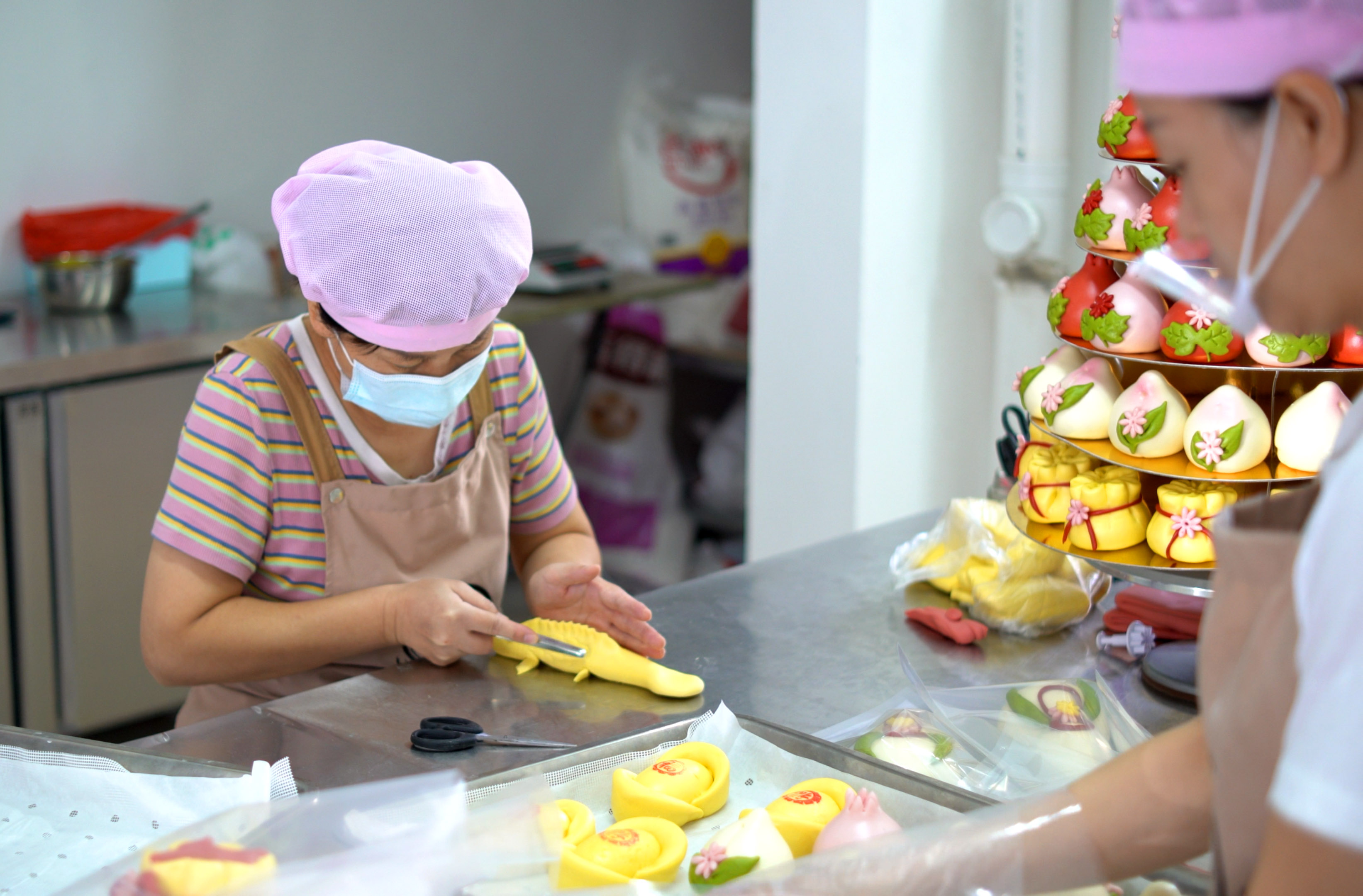 解春红一边忙着手里的活儿一边介绍:“做这个花馒头必须要把面揉好压好,我们仅一道压面的工序就要重复三十多遍。压好的面既有光泽,做出的造型也漂亮,不易开裂。”手工制作的花饽饽均采用天然健康的原材料,口感好,造型丰富,而且富有美好的寓意,能满足人们生日、婚礼、乔迁、庆典等不同场合的庆祝需求。“现在大家对这种既传统又健康的东西越来越认可,我们中秋节的订单已经忙不过来了。”