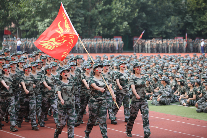 上午8点,在慷慨激昂的国歌声中,会操表演正式拉开序幕。在庄严的升国旗仪式后,班旗一挥,他们昂首挺胸,迈着整齐划一的步伐,口号响彻云霄,带着满腔的青春活力,以朝气蓬勃气宇轩昂的精神面貌走向主席台接受检阅。此时,整装迷彩服的绿色纹路是会操表演场上最靓丽的景色。