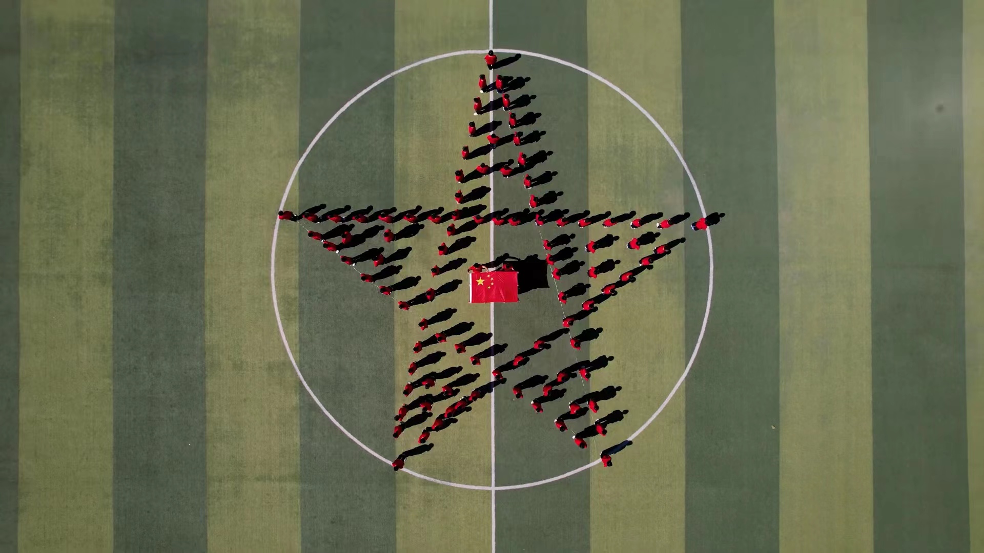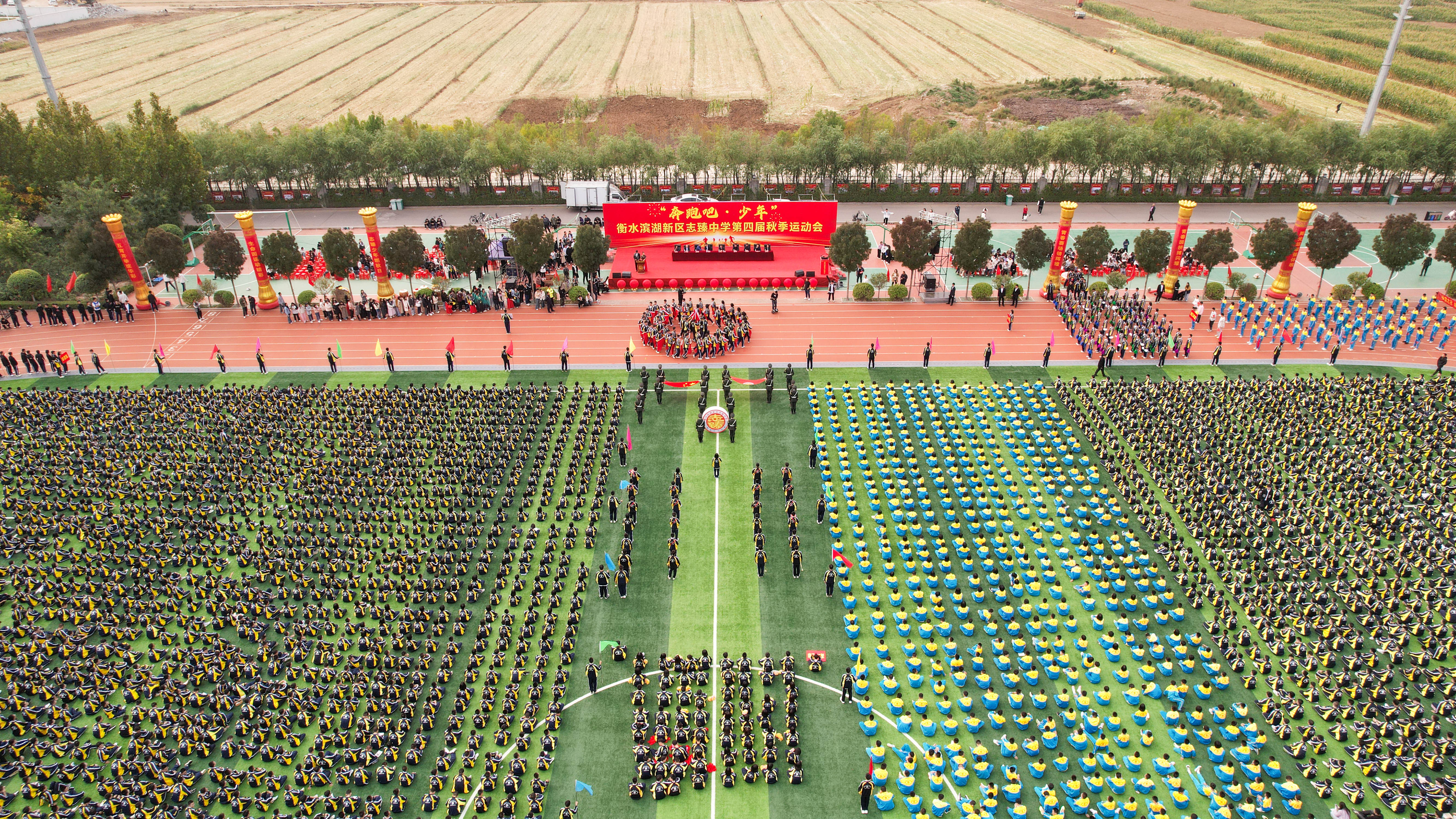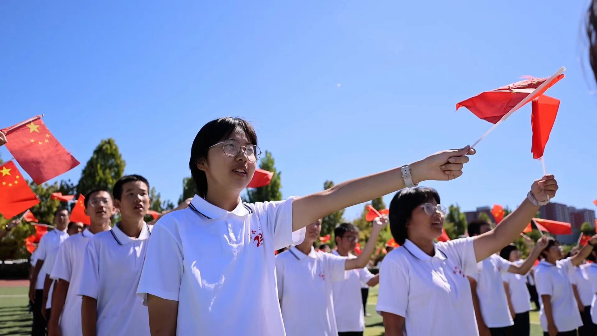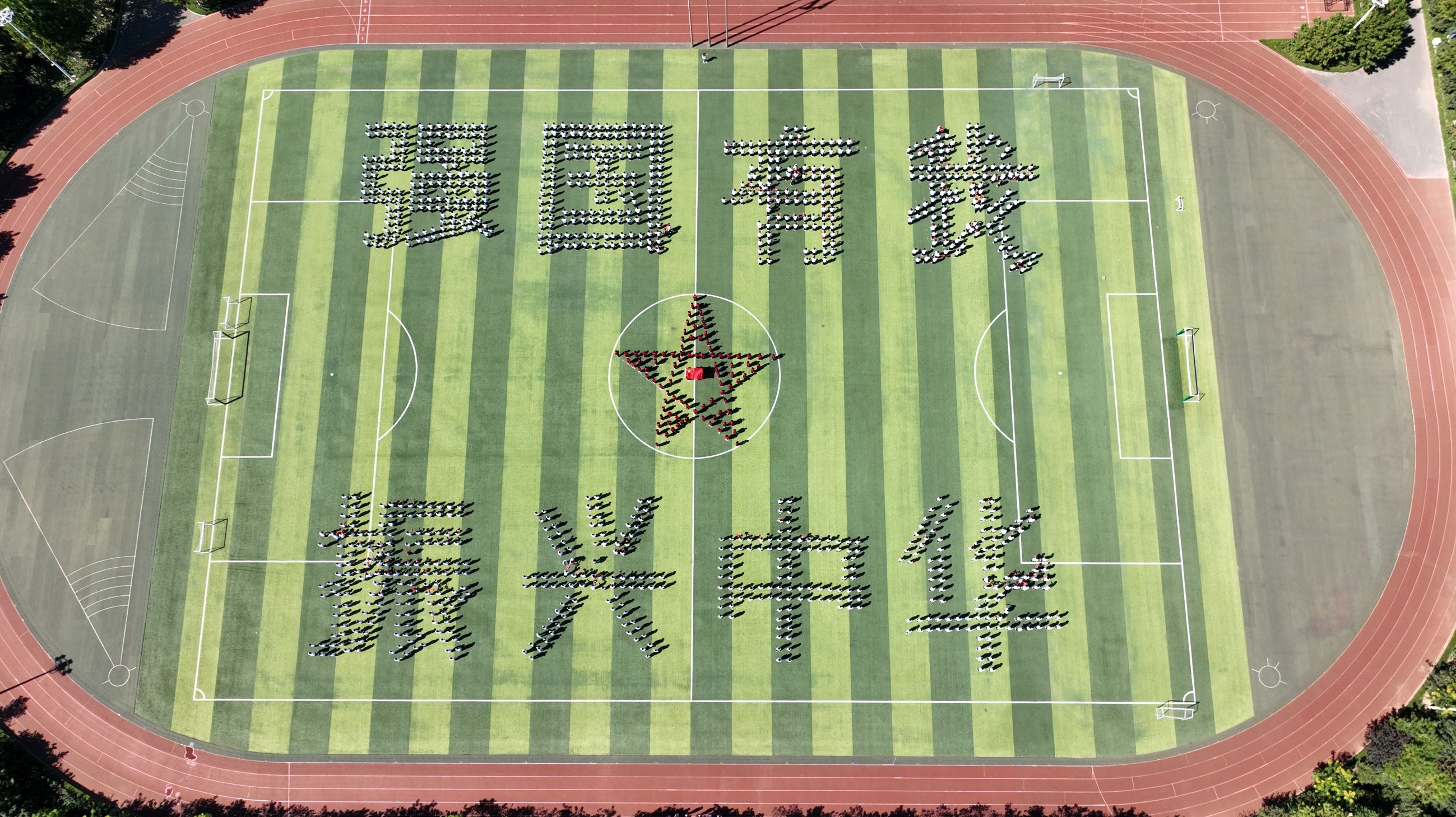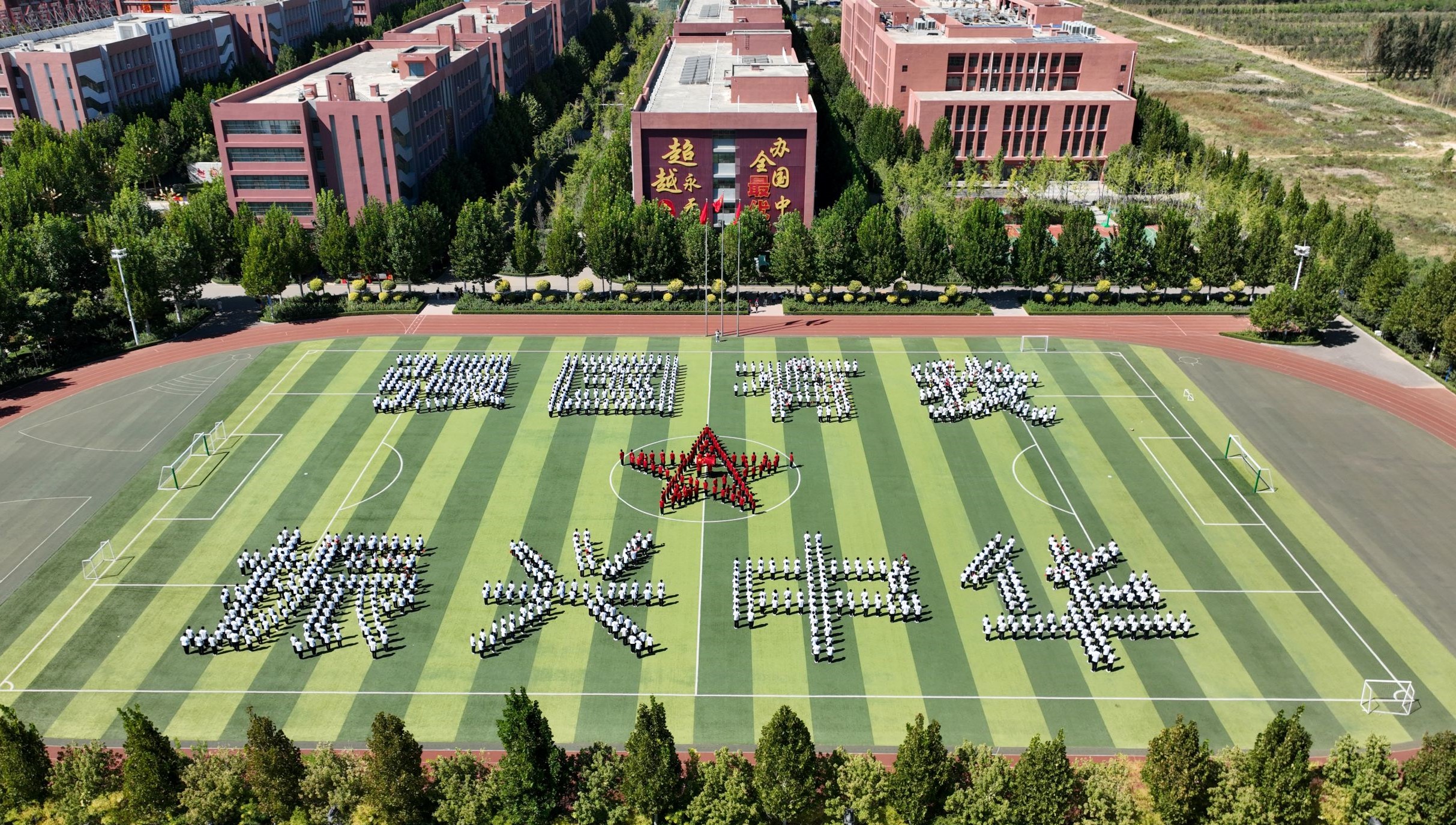 9月26日,衡水滨湖新区志臻中学千余名学生齐聚操场,手举五星红旗,摆出红色五角星与“强国有我 振兴中华”的巨字方阵,以特殊的方式献礼国庆,传承红色基因,厚植爱国情怀。