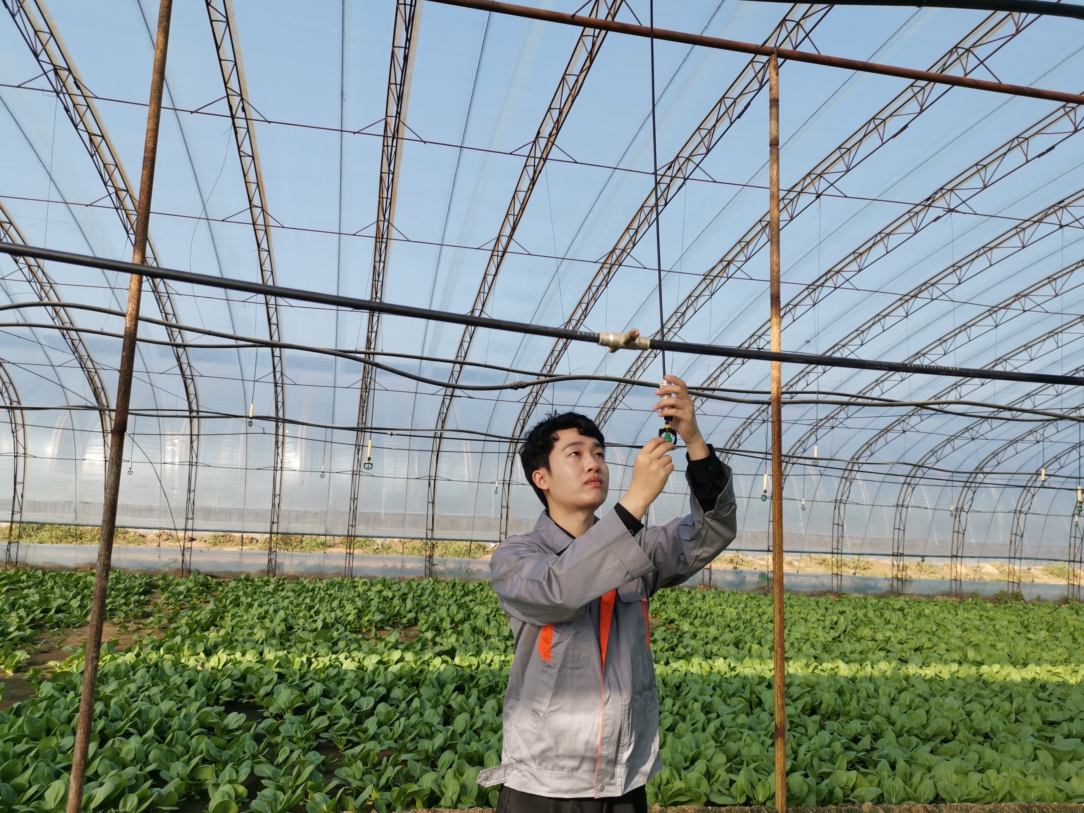 时至深秋,天气骤冷,大地里的果蔬大多已采摘完毕。但深州市榆科镇智慧农业果蔬基地里,却是一派生机盎然的景象:一座座果蔬大棚整齐排列,大棚内葡萄藤郁郁葱葱,油菜青菜翠绿欲滴。远处大棚的一角,几个果农竟然在“玩手机”……