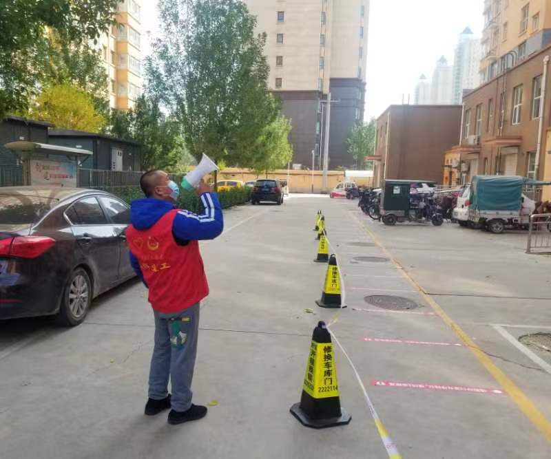 “还没有做核酸的居民,请下楼做核酸了,做完核酸的居民,尽快回家,不要在楼下逗留……。”10月20日上午8时,在隆兴小区内,身穿红色马甲的志愿者藏威,正拿着小喇叭扯着嗓子在喊话,提醒居民有序下楼做核酸检测采样。