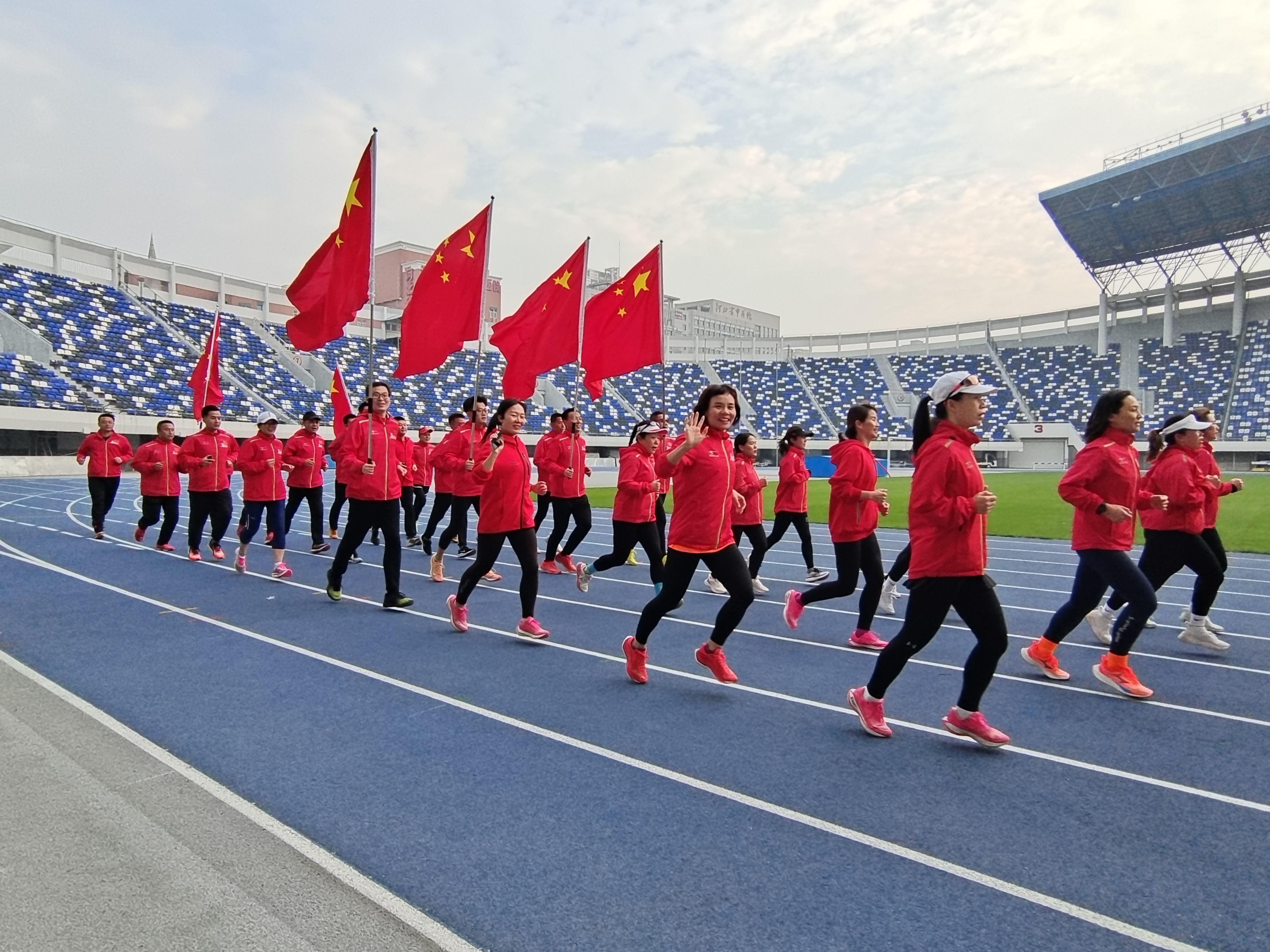 石家庄跑友在石家庄裕彤国际体育中心参加线上跑步活动