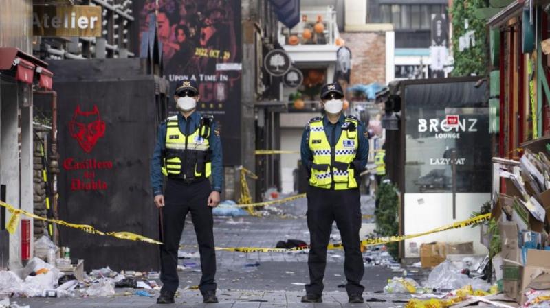 10月30日,警察在韩国首尔的踩踏事故现场警戒。新华社 图
