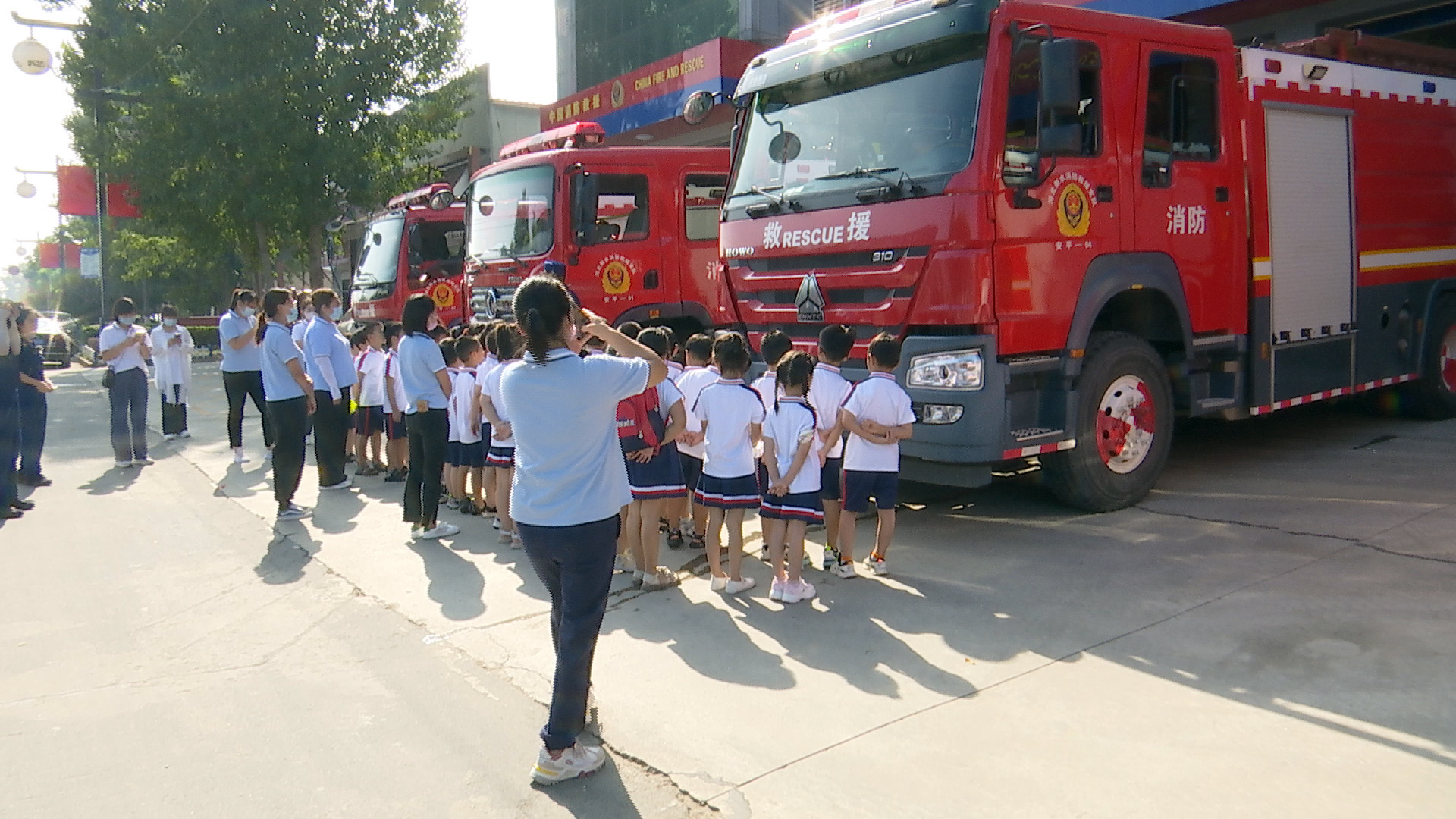 现场,小朋友们走到消防车前,仔细聆听消防人员对消防车名称、性能及用途的讲解,并登上消防车,零距离体验。在大队荣誉室,一幅幅生动的图画,向学生们全方位、多角度、系统化展示了大队自建队以来防火灭火工作及队站建设中取得的优异成绩和突出贡献,充分展示了消防队伍的光荣历史和精神风貌。在战斗班,消防人员手把手教孩子们将被子叠成“豆腐块”,赢得了大家阵阵掌声。在消防大院内,消防人员向学生们展示了各类消防器材装备、防护服装以及日常训练的绳索攀爬科目,并指导学生们使用消防水枪。