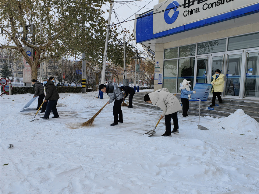 近期,枣强县迎来多年未遇之寒潮降温降雪天气,雪花漫天飞舞,处处银装素裹。厚厚的积雪给前来往办业务的客户带来不便,为迅速清理积雪,确保客户安全,建行衡水枣强支行行长石继忠带领全体员工开展清雪除冰活动。