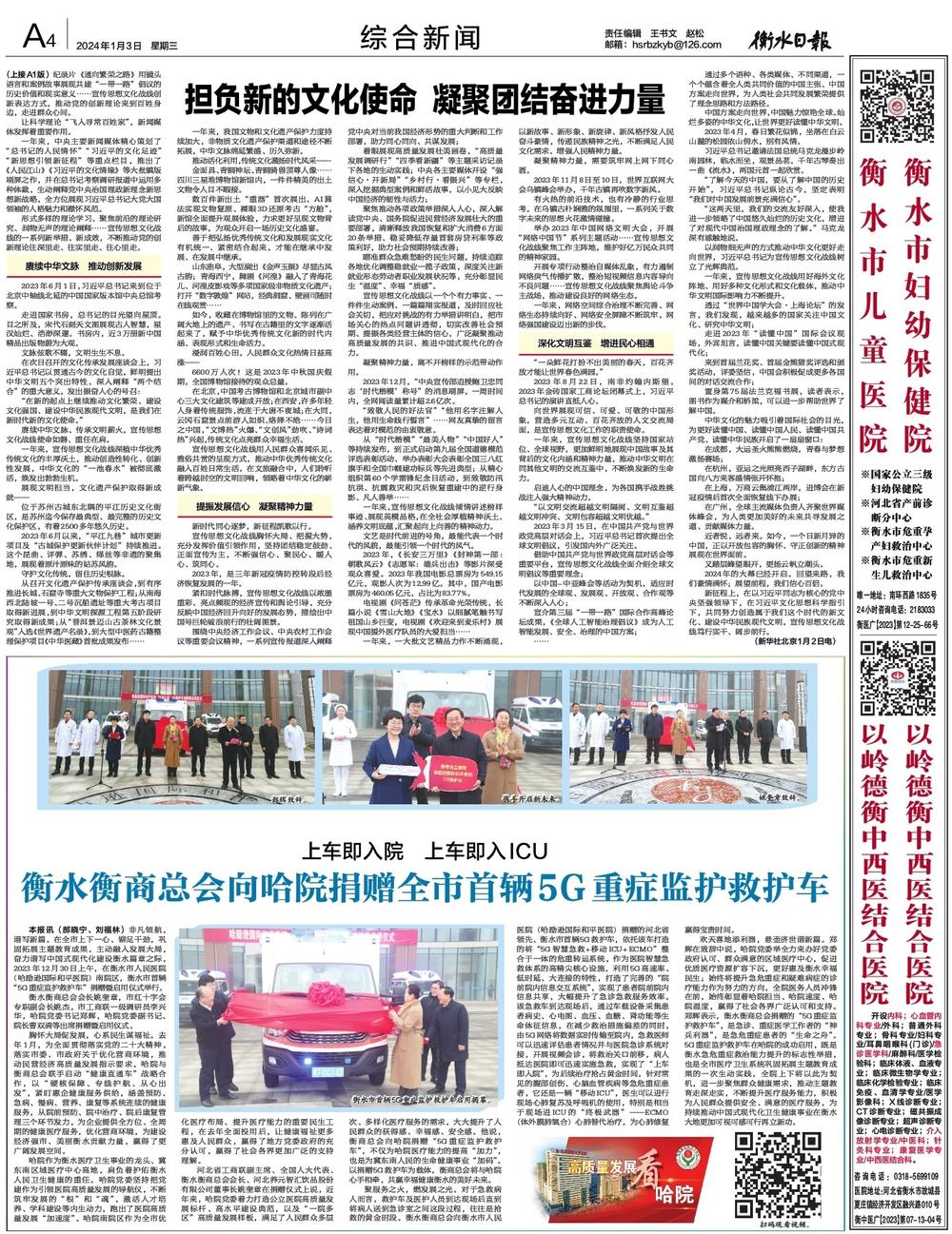 非凡领航,谱写新篇。在全市上下一心、铆足干劲,巩固拓展主题教育成果,主动融入发展大局,奋力谱写中国式现代化建设衡水篇章之际,2023年12月30日上午,在衡水市人民医院(哈励逊国际和平医院)南院区,衡水市首辆“5G重症监护救护车”捐赠暨启用仪式举行。