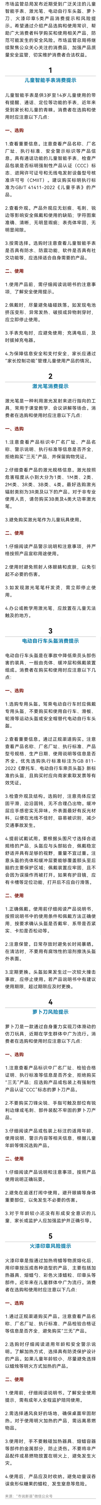 详情:近日,市场监管总局发布受到广泛关注的儿童智能手表、激光笔、电动自行车头盔、萝卜刀、火漆印章等五类产品消费提示和风险提示,帮助广大消费者科学购买和使用相关产品。