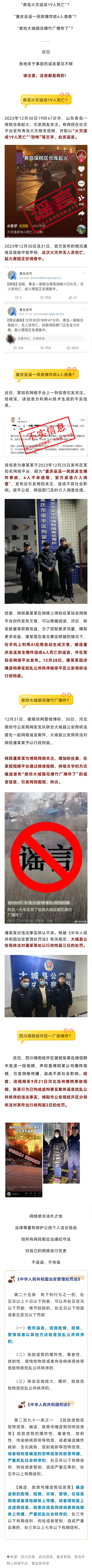 详情:“青岛火灾造成19人死亡”“重庆巫溪一民房爆炸致4人遇难”“廊坊大城烟花爆竹厂爆炸了”……近日,各地关于事故的信息屡见不鲜,但其实,这些都是谣言。目前,散布以上虚假信息、扰乱公共秩序的违法人员均已被警方依法处罚。网络绝非法外之地,法律尊重和保护公民个人言论自由,但所有网民都应当遵纪守法,对自己的网络言行负责,不造谣、不传谣。(来源:“中国应急管理”微信公众号)