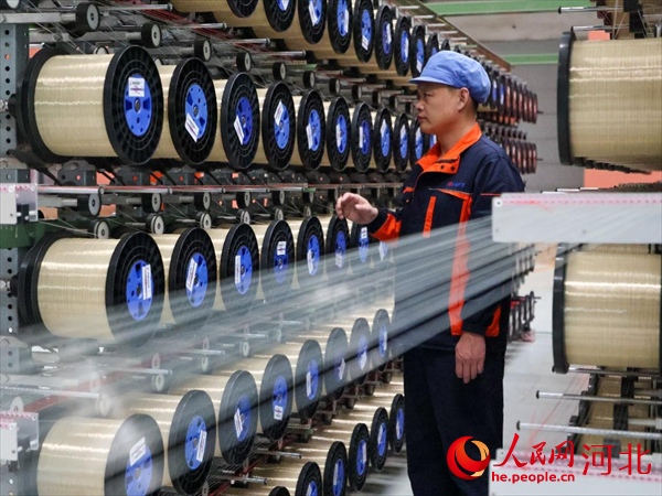 河北鹤煌网业股份有限公司车间内,工人正在检查网丝整经工序中是否有断丝、绕丝的情况。 人民网 戴泽鑫摄