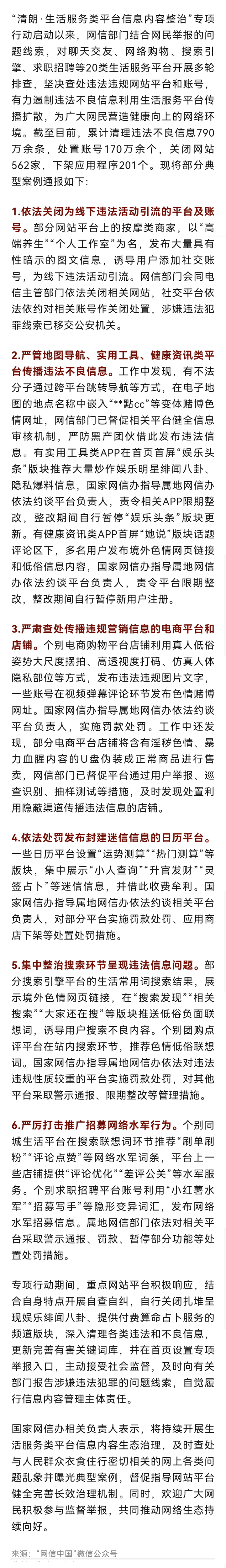 详情:“清朗·生活服务类平台信息内容整治”专项行动启动以来,网信部门结合网民举报的问题线索,对聊天交友、网络购物、搜索引擎、求职招聘等20类生活服务平台开展多轮排查。截至目前,累计清理违法不良信息790万余条,处置账号170万余个,关闭网站562家,下架应用程序201个。现将部分典型案例通报如下: