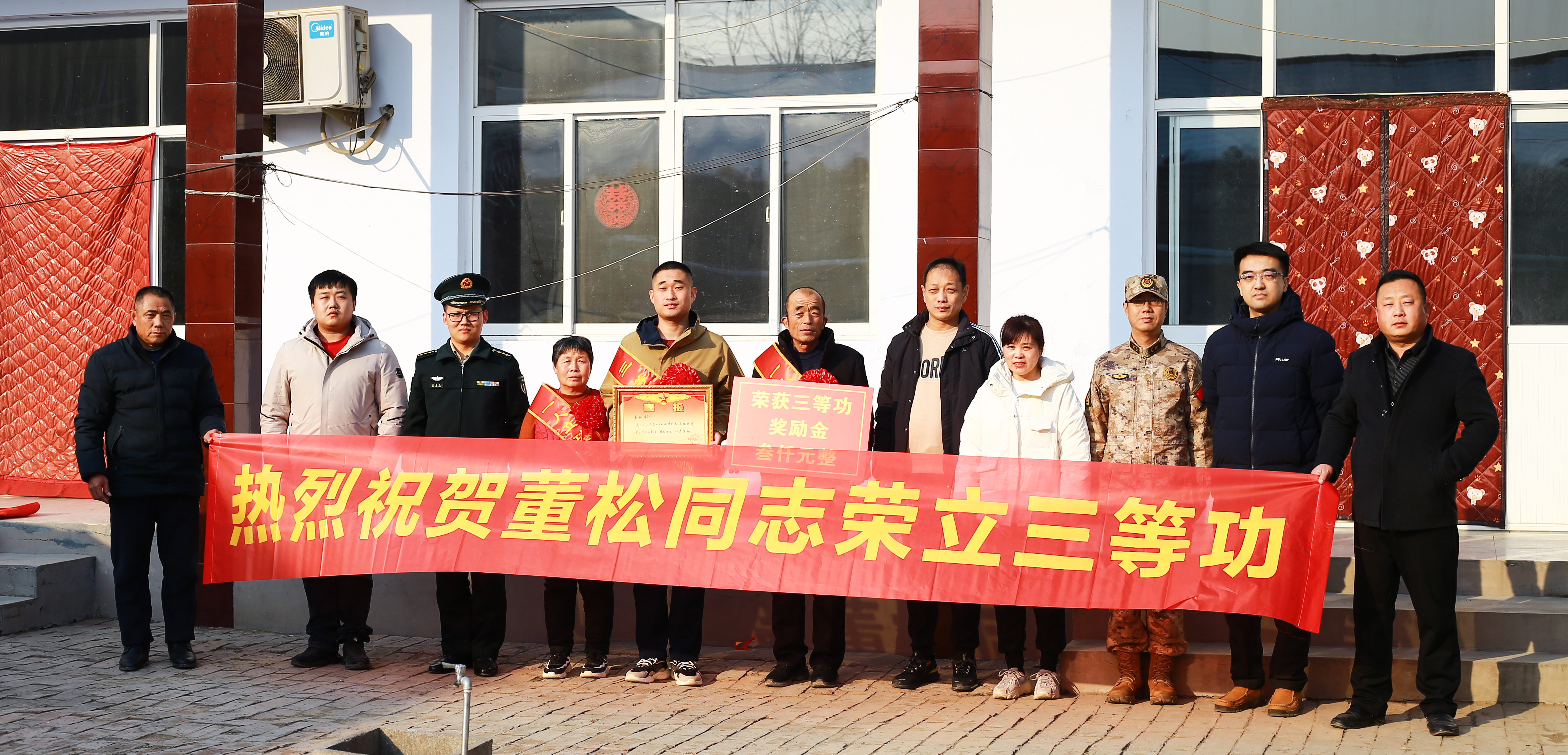 1月8日下午,衡水高新区退役军人服务中心、大麻森乡退役军人服务站、乡武装部一行人来到现役军人董松家中,为立下三等功的董松家属送去喜报、红花和慰问金,对董松在部队取得的优异成绩表示祝贺,向立功军人家属表达党和政府的关怀和问候。