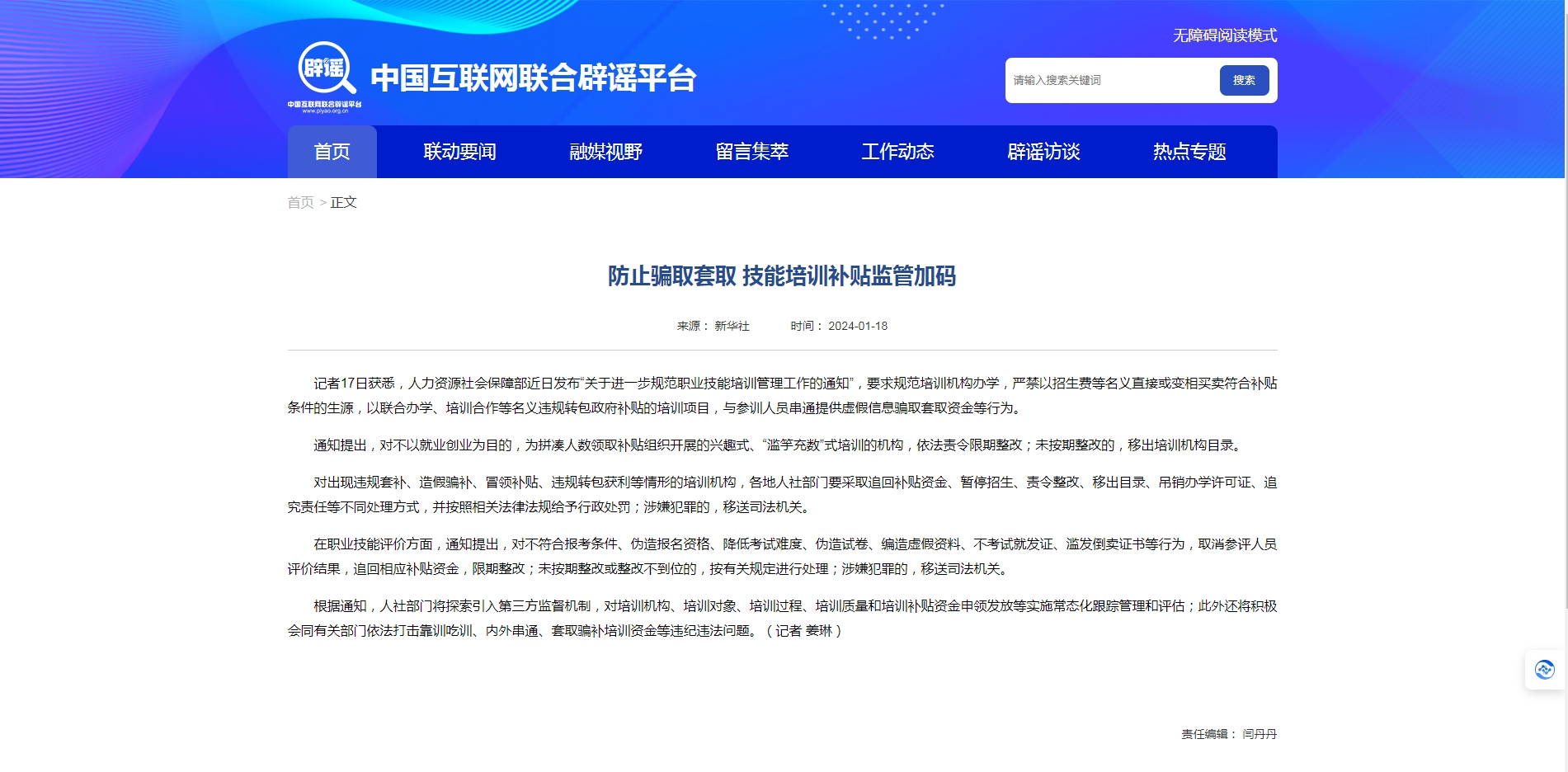 根据通知,人社部门将探索引入第三方监督机制,对培训机构、培训对象、培训过程、培训质量和培训补贴资金申领发放等实施常态化跟踪管理和评估;此外还将积极会同有关部门依法打击靠训吃训、内外串通、套取骗补培训资金等违纪违法问题。(来源:新华社)