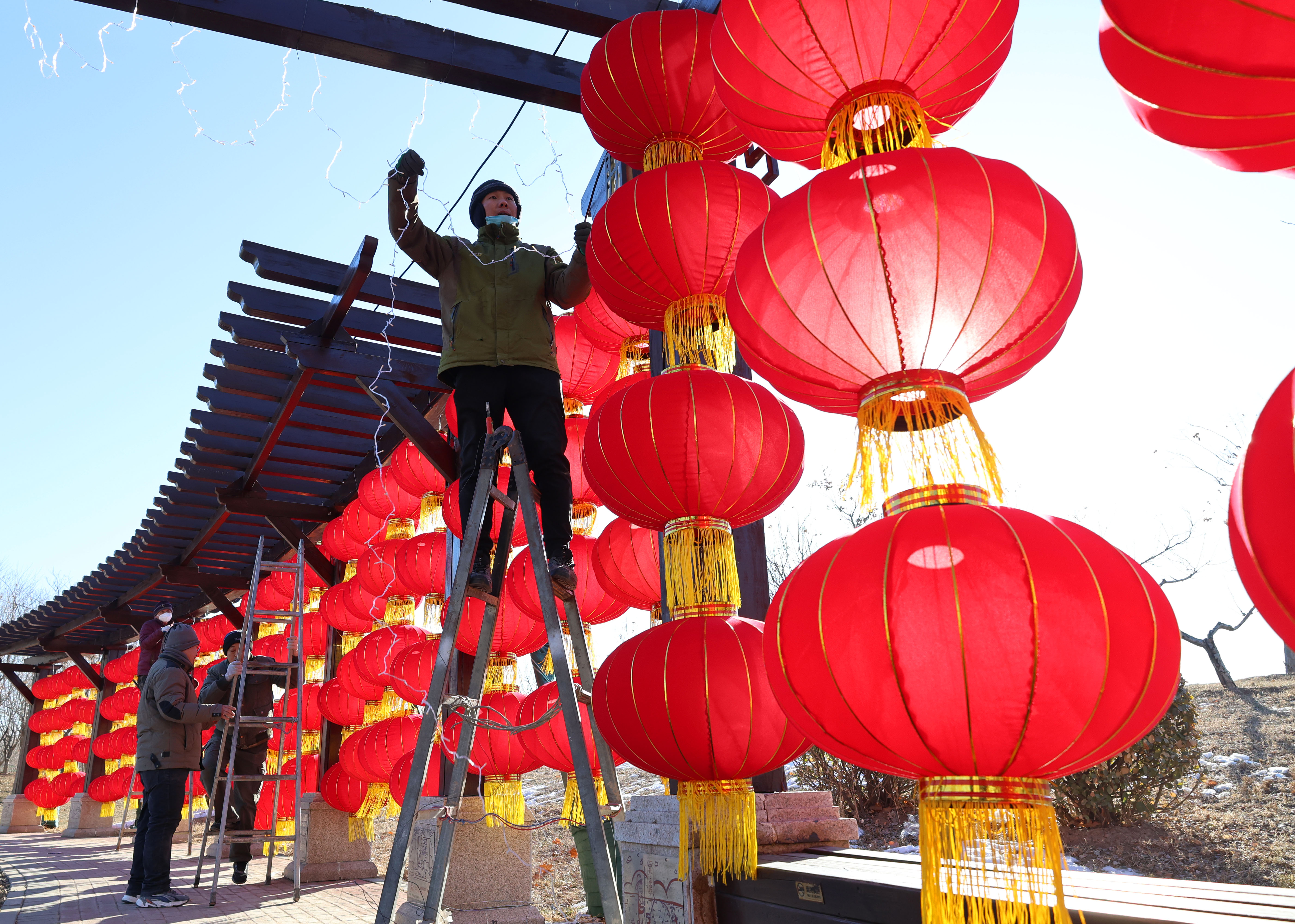 记者来到公园风雅文化园区,远远看到工人们冒着严寒,正在进行灯笼的安装和调试。在古诗词长廊区,长廊一侧已经挂满红彤彤的灯笼,中间搭配着亮化古诗词。待夜幕降临,灯火阑珊,树木为骨,诗词为魂,百余组诗词灯笼如荧荧流星,袅娜悬于空中,在唯美的氛围中感受传统文化的魅力。该灯组高4米,长45米,目前已经完成80%的安装进度。