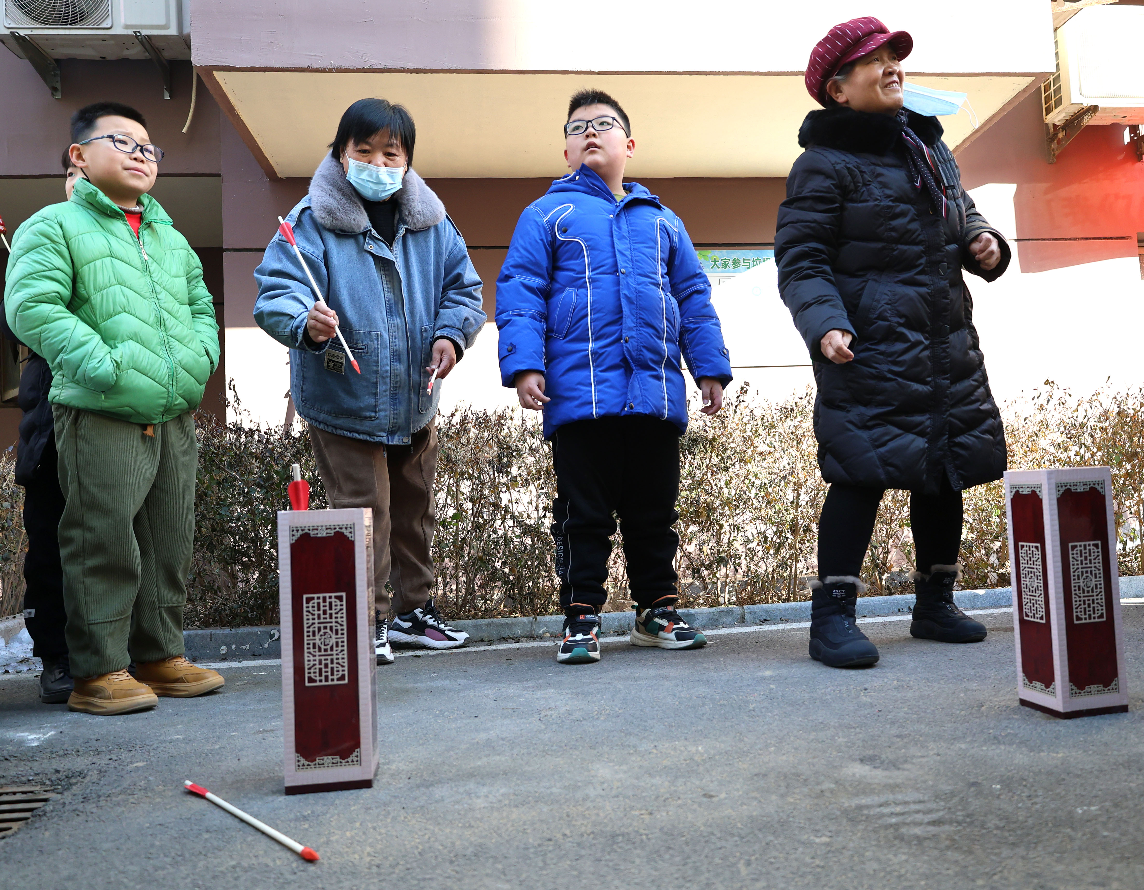 现场最热闹的还有投壶场地。听完老师向大家介绍的投壶的起源、玩法﹑规则后,大家都对投壶表现出了极大的兴趣,迫不及待地排起队,准备一展身手。每位居民有5支箭,投中5支箭可免2个月物业费,投中4支箭免一个月物业费,投中3支箭奖励又红又甜的糖葫芦一串。一轮游戏体验下来,糖葫芦的摊位被大朋友小朋友包围。居民们各个意犹未尽,喜悦之情溢于言表。