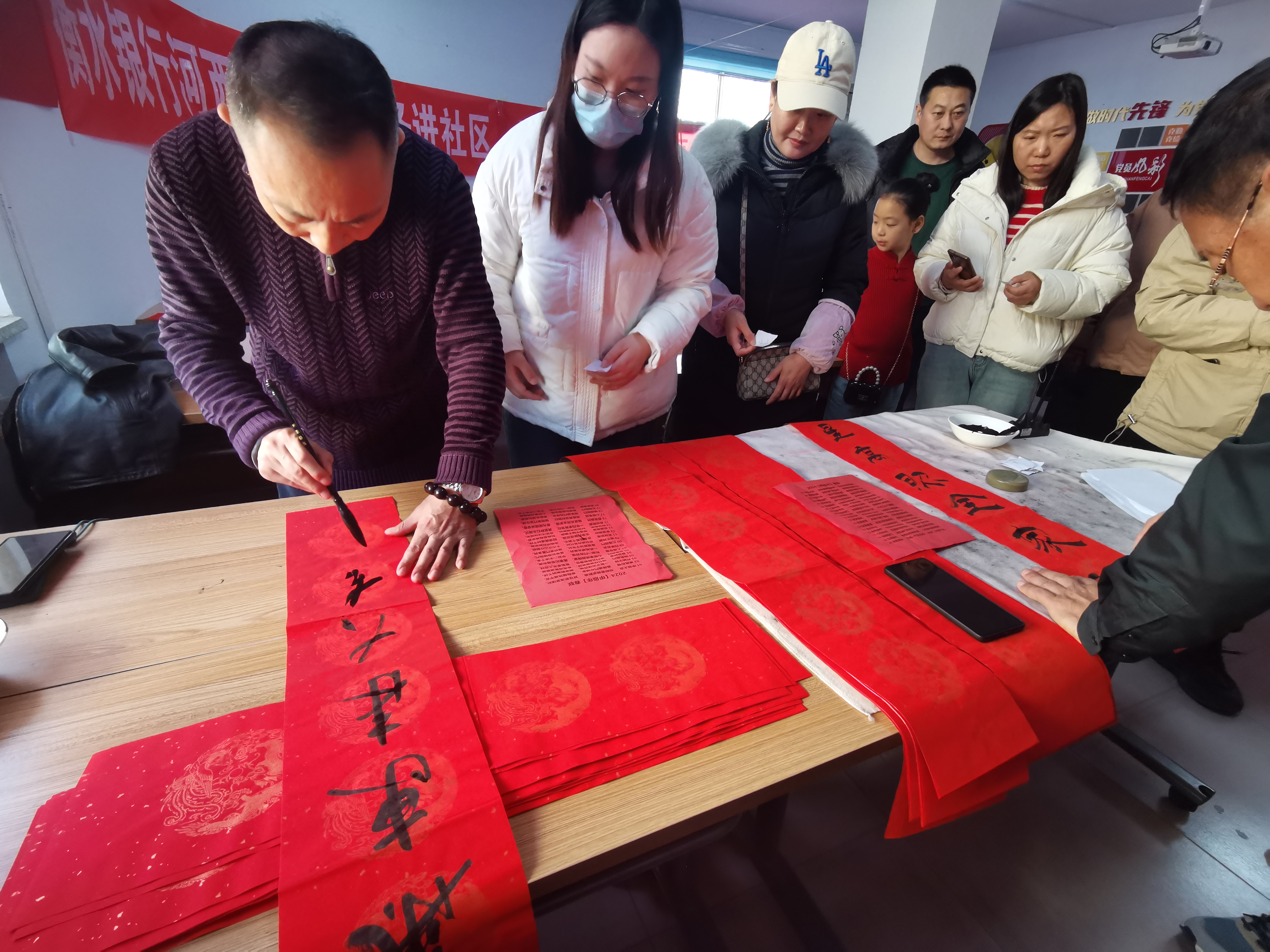 活动邀请了衡水毛体书法家协会的陈九如老师和王乃浩老师为社区居民免费写春联。“老师请帮我写一张‘瑞气满门吉祥宅,春风及第如意家’,横批‘福禧临门’。”“老师我想要一张‘福星高照全家福,春光耀辉满堂春’,横批‘春意盎然。’”……大家都迫不及待地将自己心仪的对联句子告诉两位老师。红纸铺开,两位老师手持毛笔蘸饱墨汁,认真地为居民书写,一笔一划间倾注了他们的感情和祝福。