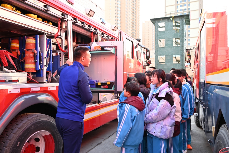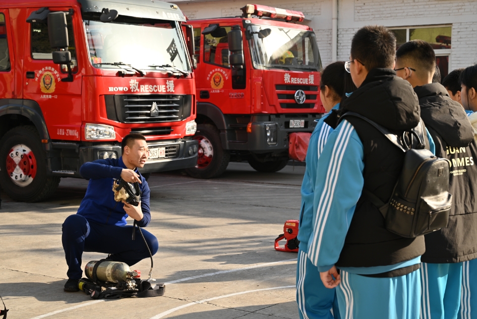 活动开始,消防战士向同学们讲解了常见消防器材的工作原理及其在灭火救灾、抢险救援中所发挥的作用,演示了消防战斗服、空气呼吸器等消防装备器械的操作使用方法,随后带领大家参观了新型消防应急救援车并邀请同学们上车体验。