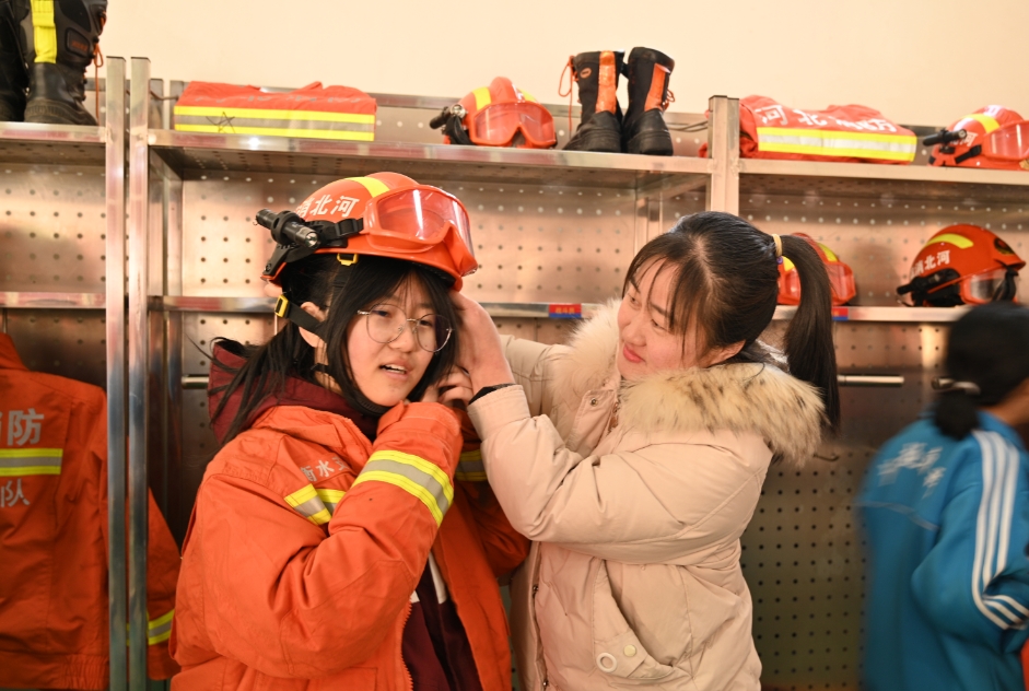 为更好地让志愿者们感受消防队员的生活,消防员还特意让同学们过了一把“消防瘾”:穿消防服、戴消防帽。初次训练,几名同学都手忙脚乱:“哇,这个衣服也太重了!”“是啊,这帽子也好重。”当听到消防战士全副武装时需负重30公斤,同学们无不惊讶地张大了嘴巴。欢声笑语中,大家跟随消防战士走进生活区参观。从出警救火到抢险救援,走廊上的一张张照片生动展现了消防战士的日常生活;宿舍里,消防员给同学们传授叠被子的秘籍,一番操作,整齐方正、棱角分明的“豆腐块”呈现在大家面前。