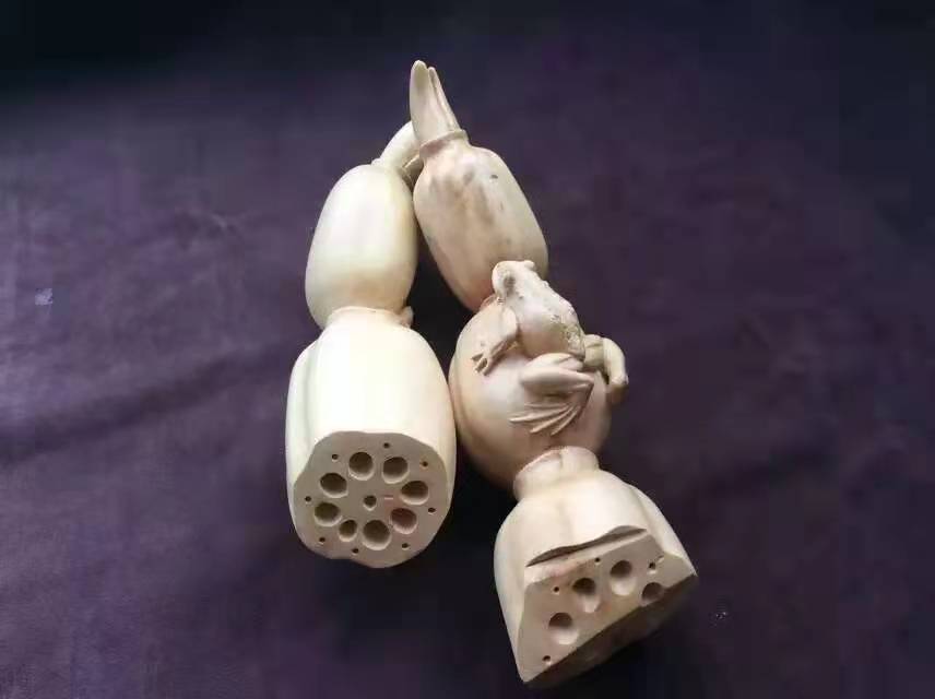 黄杨木雕青蛙莲藕。