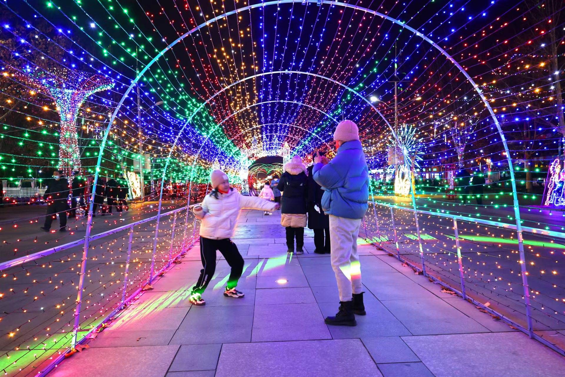 火树银花不夜天,簇簇花灯映烟霞。当晚7时许,记者来到衡水市区九州广场,一场梦幻灯光节华丽启幕。这里锣鼓喧天、灯影闪烁,更有绝美的北极光及“龙凤呈祥”灯光秀表演。彩灯长廊、航天英雄、梦幻钢琴……各种造型新颖的彩灯组合齐聚,现场还有儿童游乐项目和各类亲子活动,走进这里仿佛进入了充满诗意和童心的奇妙世界。“好美啊,没想到家门口就有这么漂亮的灯光秀可以看,太有过节的氛围了!”正在彩灯长廊下给孩子拍照的市民窦女士开心地说。