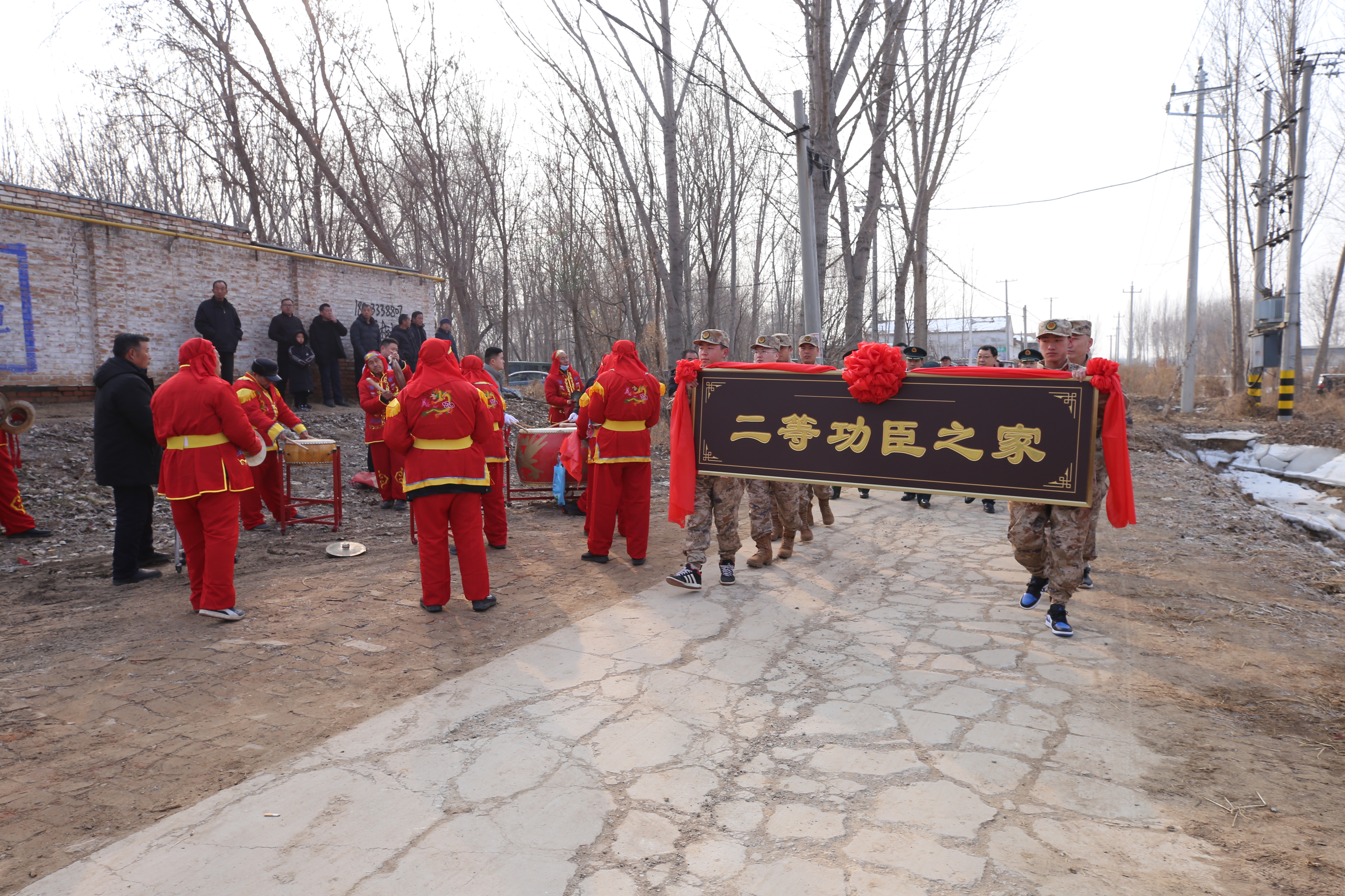 当天上午,烧盆屯村口锣鼓喧天、热闹非凡,全村乡亲闻讯后纷纷赶来,一起分享孟文他们家的荣光时刻。伴随着阵阵锣鼓声,送喜报的队伍抬着“二等功臣之家”的牌匾,喜气洋洋地向孟文家中走去。