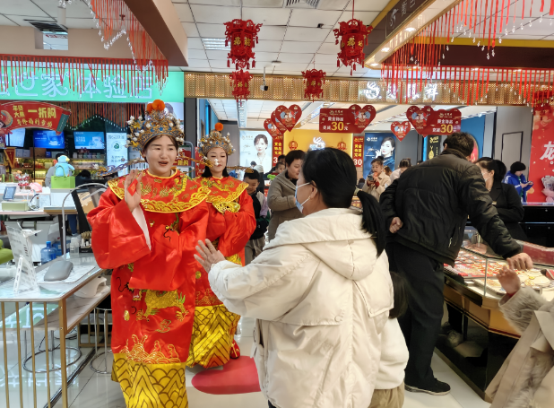 平价百货事业部旗下的衡水市区/冀州/武邑/深州/枣强吉美购物广场,五店联动打造“吉美购物广场年货节”:买年货、享好礼、送祝福……掀起龙年消费第一波热潮。聚焦场内,处处洋溢着新春的喜悦氛围,装饰喜庆的柜台、琳琅满目的商品、络绎不绝的顾客,全家老少齐上阵,一派热闹红火的场面:市区吉美购物广场举办民俗年味集,邀请书画名家挥毫泼墨,现场写春联、送春联。由员工扮演的财神爷通过“财神送福”让顾客“新春见喜”,吸引顾客争相与之拍照;深州吉美购物广场举办新春舞狮,为新年舞得一个好彩头;顾客现场参与投壶活动,进行棉花糖DIY等活动,将新春仪式感拉满!