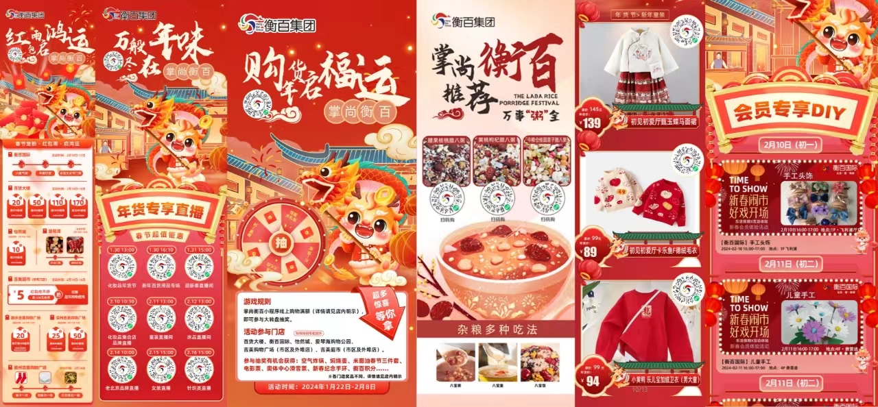 用创意焕新传统文化,点燃龙年消费体验新潮流。春节期间,衡百集团各个卖场热闹非凡、人气爆棚,洋溢着饱满热烈的节日气氛。漫步其间,龙年元素主题陈列,格外夺目,处处彰显的中国红,将过年的仪式感和氛围感不断拉满。而舞龙舞狮、福气财神送财、汉服巡游、民俗表演、乐队驻唱……这一场接一场的人气新春游园活动,在传递浓浓文化魅力时,让各门店结合生活场景和情绪价值,齐放异彩,解锁更多“微度假”时尚购物的新玩法。