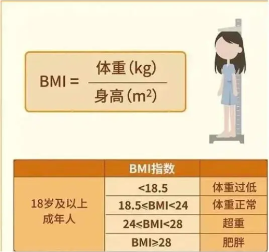 我国健康成年人的BMI正常范围为18.5kg/m2≤ BMI<24.0kg/m2,24.0kg/m2 ≤BMI<28.0kg/m2为超重,BMI ≥ 28.0kg/m2为肥胖,BMI<18.5kg/m2为体重过低。