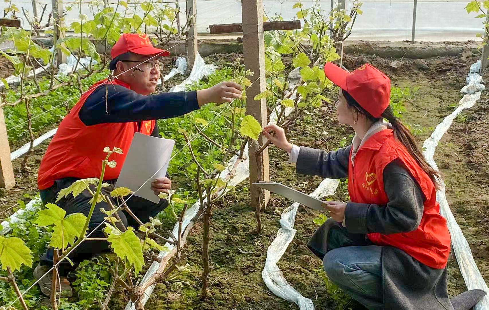 饶阳县气象局技术人员进温室调研葡萄长势。