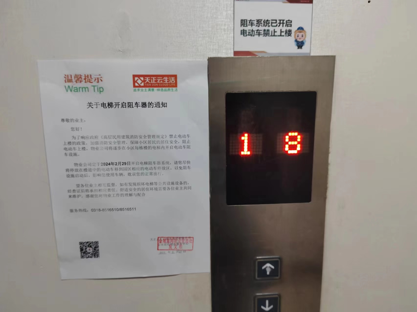 2月28日上午,在金域蓝湾小区,记者随机走访了几栋住宅,未发现电动自行车“上楼”现象,在疏散通道、楼梯间等地也未发现停放的电动自行车。小区物业在每栋楼的电梯口都贴着《关于电梯开启阻车器的通知》,明确为保障小区居民的居住安全,阻止将电动自行车推上楼,自2月29日开启电梯阻车器系统。小区内的居民也对电动自行车“上楼”的现象表达了自己的看法。“看到高层因电动车着火的新闻让人触目惊心,把电动车推上楼太危险了,为了自己和邻居的安全,我们平时都会把电动车放在楼下的车棚里。”2号楼的居民朱先生告诉记者。