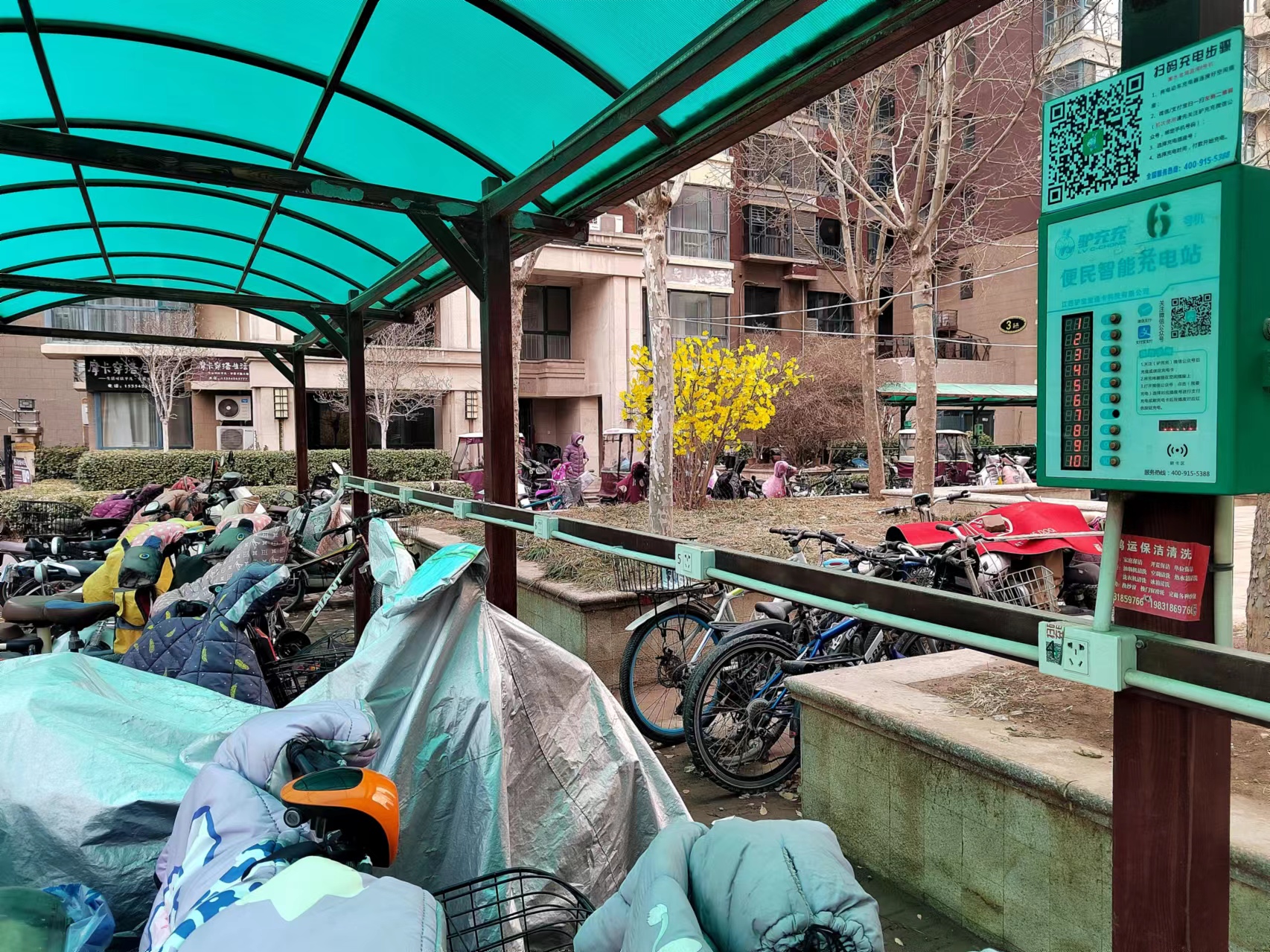 随后,记者来到公园壹号小区,在一栋高层居民楼外看到,好几根长长的电线从几层甚至十几层一直垂到地面,长长的电线连着插排裸露在外,遇到刮风下雨天气,很容易发生漏电问题。“上楼充电不仅麻烦,而且危险,无论是电梯内还是家里充电,都会发生燃烧、爆炸等事故,可是我们楼下充电桩很少,满足不了居民的需求,为了第二天有交通工具使用,我们只能推上楼。”一位居民告诉记者,真希望小区多建几个车棚,多安装一些充电桩。