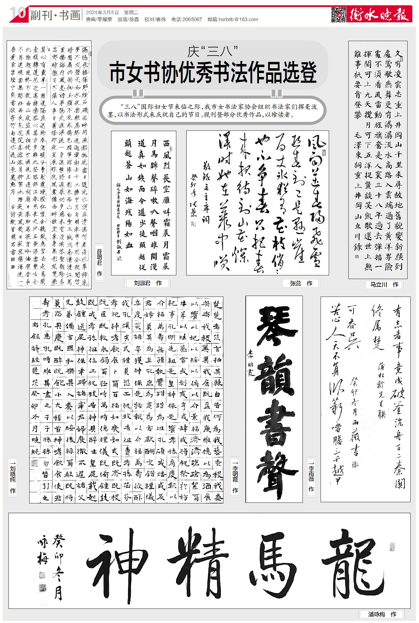 “三八”国际妇女节来临之际,我市女书法家协会组织书法家们挥毫泼墨,以书法形式来庆祝自己的节日。现刊登部分优秀作品,以飨读者。 薛明君 作刘淑君 作张蕊 作马立川 作刘晓纯 作李明霞 作李雨薇 作潘咏梅 作编辑:李耀荣 点赞 +1 微博 微信 我要评论 发布 相关推荐 近镜头|习近平总书记寄望中越青年做好“接棒人” 时政 8小时前 习言道|多用一些时间静心读书、静心思考 要闻 8小时前 此行间·谈国家安全,总书记用过这些精彩比喻 要闻 15小时前 第一观察|总书记指引书香社会建设 时政 16小时前 家教有法 守护有方 景县开展家庭教育指导服务进万家活动 衡水速览 16小时前 “衡消费 懂权益”活动进社区 普法便民暖民心 衡水速览 17小时前 总书记引领强国之路|以质图强 筑牢发展之基 时政 19小时前 越共中央总书记、国家主席苏林到雄安新区参访 政情 1天前 热门 一天 三天 一周 1 衡水市药品不良反应监测中心获全国通报表扬 2 百余件(套)冀派内画精品走进甘肃瓜州 3 武邑县多部门联合开展“全国肿瘤防治宣传周”主题宣传活动 4 衡水德州市场监管联动 优化外资营商环境 5 姚黄魏紫初绽蕊 满园春色惹人醉 衡水中华公园牡丹花开了 6 礼乐润童心 古训焕生机——孙敬学堂以沉浸体验激活传统文化 7 武邑:义诊进社区 健康“零距离” 8 衡水市第三人民医院开展肿瘤防治宣传周义诊活动 9 守护市民“脚下安全” 衡水主城区沥青路面病害集中整治见实效 10 阜城荀园:“牡丹”独秀梨园 “慧声”长萦故土 ——我市文化建设走笔之九 1 雄商高铁河北段开始联调联试 2 舞蹈、绘画、音乐……衡水公益课堂今起报名 “双课堂”点亮全民艺术生活 3 【小牛大凯帮办团】衡水:露天垃圾池拆了 崭新垃圾桶“上岗” 4 景县王千寺镇中心小学举办校园科技节活动 5 全国首批试点收官 安平丝网产业提质成效显著 6 【最美夕阳红】琴弦伴岁月 国粹润夕阳 ——衡水退休教师刘存水奏响晚年幸福曲 7 以水为基强韧性 治水兴城护民生 ——武强县探索北方县域防洪排涝与水安全保障路径 8 “机械联动+人工补扫” 衡水主城区打响“飞絮治理战” 9 衡水市阜城县漫河镇后李庄村:5天打通35亩大棚“生命线” 10 为营商环境清障 故城县严惩职业投诉敲诈 1 第二十一届京津冀开发区“枣复材杯”乒乓球邀请赛暨招商引资推介会在枣强举行 2 衡水市举办0—6岁儿童孤独症筛查培训班 3 衡水开放大学2026年春季招生即将结束 4 “妈妈你在哪儿” 衡水刘风旭寻找走失18年的母亲盼团圆 5 《互联网平台价格行为规则》正式实施 明确禁止“大数据杀熟” 6 “迁徙有信·文脉有声”衡水湖生态摄影大赛颁奖暨赏花季采风活动圆满举行 7 “武邑红梨”牵手“硬木雕刻” 双IP联动助推农文旅融合与产业升级 8 海报系列||早安衡水 9 衡水滏阳河管理中心:亲近自然 文明露营 共同守护河畔美景 10 新华社评论员:为两岸谋和平 为同胞谋福祉 为民族谋复兴 广告 广告 广告 24小时 1 阜城县王集乡开展国家安全教育系列宣传活动 2 海报系列||早安衡水 3 习言道|多用一些时间静心读书、静心思考 4 【讲习所·中国与世界】习近平:中越要同心协力 携手同行现代化道路 5 衡水高新区开展“4·15全民国家安全教育日”主题宣传活动 筑牢基层安全防线 6 把安全种子“播”进群众心里 景县开展全民国家安全教育日宣传 7 促进行业发展 景县举办跨境电商培训班 8 数据“生金” 产业焕新 ——景县打造县域数字经济新样本 9 助力家长“从容带娃” “家庭教育进万家”活动走进安陵镇 10 赏花活动开启春日浪漫景县之约