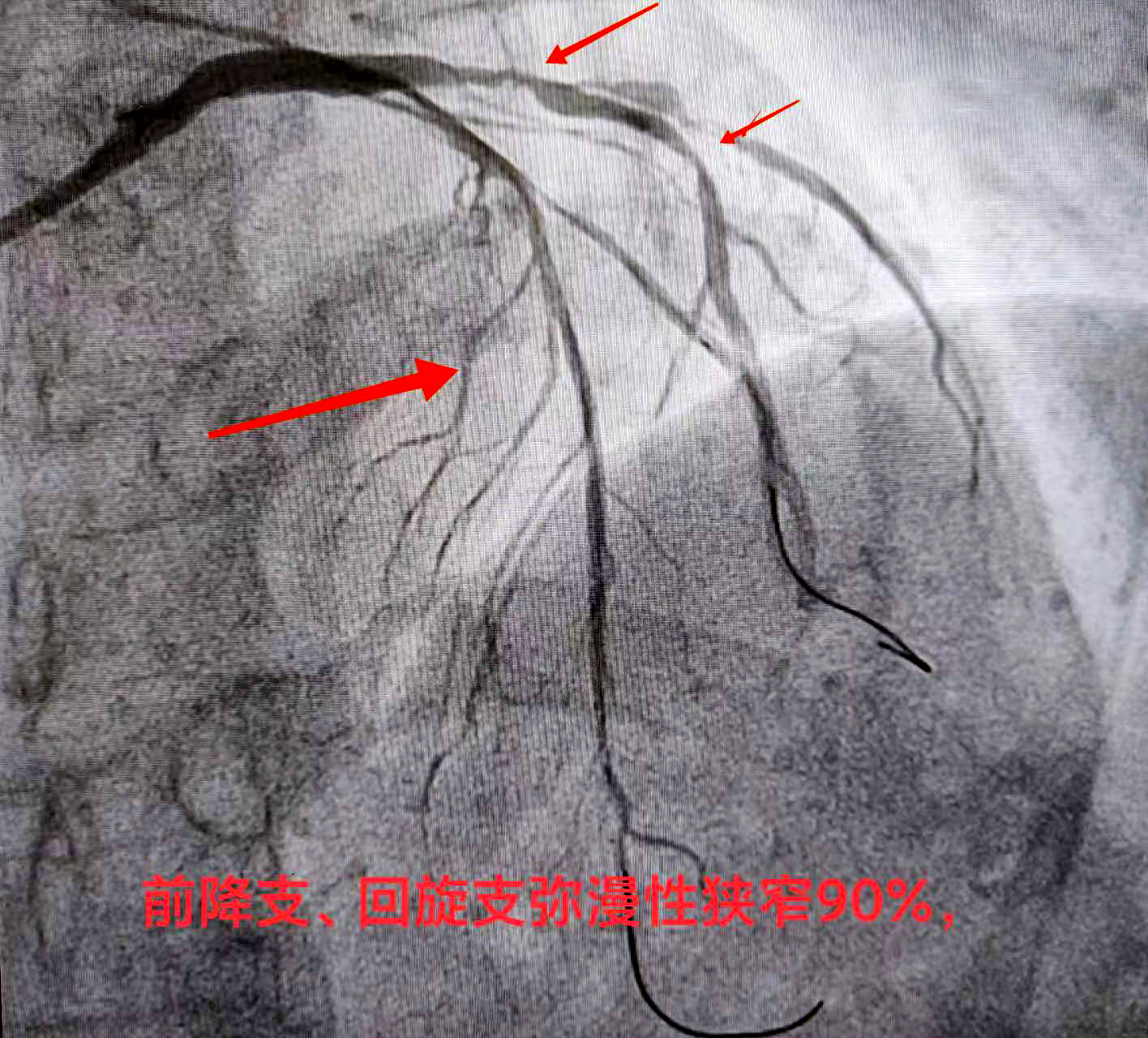 熊斌主任在接诊后立即为赵某做相关检查,结果显示严重三支病变——即为心脏供血的三条大血管前降支血管、回旋支血管、右冠状动脉,甚至包括左主干都存在狭窄病变,狭窄程度达90%以上,属于弥漫性狭窄病变。通俗地讲,就是赵某的冠脉血管近乎全都堵塞不通,血液无法顺畅供给心脏,这导致了心脏缺血,从而引起胸闷、胸痛、心慌气短等不适症状,严重者还会导致心肌坏死、心梗发生,严重威胁生命健康。
