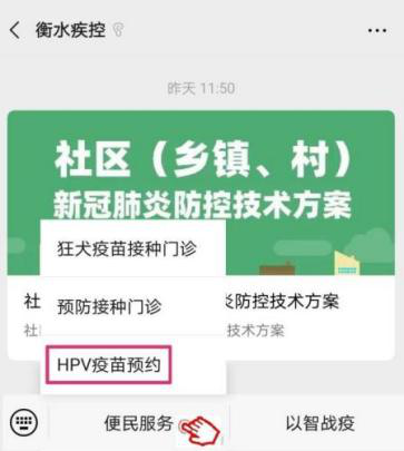 第一步:关注“衡水疾控”公众号,点击公众号底部【便民服务】→【HPV疫苗预约】