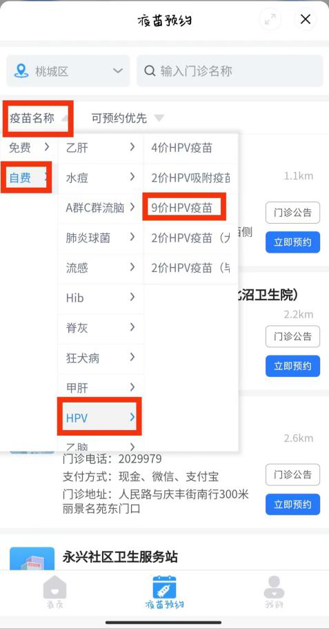 第四步:选择疫苗名称、疫苗种类、接种门诊、接种日期/时间。