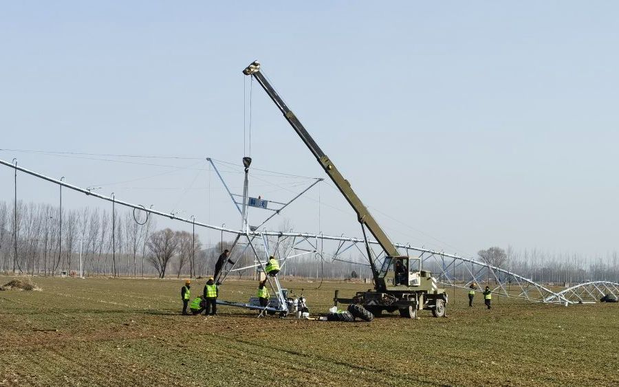搭架子、上螺丝、安装喷管……在保定市曲阳县西流德绿源家庭农场的千亩麦田里,农场负责人王爱永正指挥工人安装指针式喷灌机。王爱永说:“以前浇地至少需要两个人配合移动水管,一天浇8亩地。有了这台指针式喷灌机后,一个人用手机就可完成操控,一天能浇100亩地。”