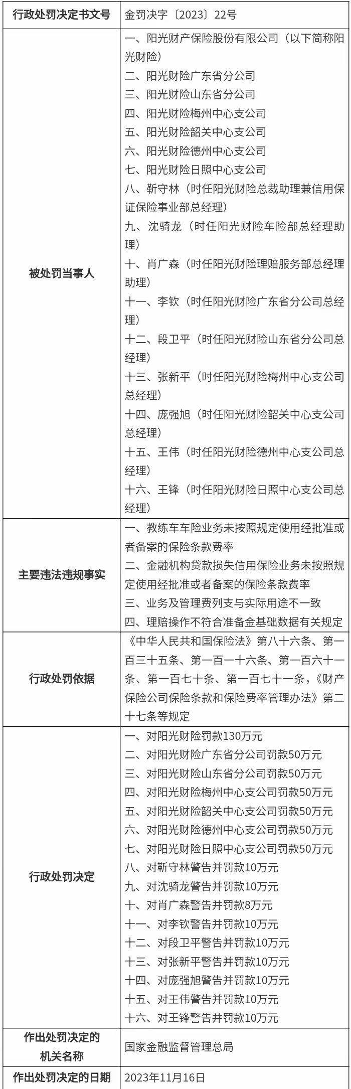 根据相关规定,国家金融监管总局对阳光财险处罚款130万元,对阳光财险广东省分公司、阳光财险山东省分公司、阳光财险梅州中心支公司、阳光财险韶关中心支公司、阳光财险德州中心支公司、阳光财险日照中心支公司分别处罚款50万元;对靳守林、沈骑龙、李钦、段卫平、张新平、庞强旭、王伟、王锋均予以警告并罚款10万元,对肖广森予以警告并罚款8万元,共计518万元。