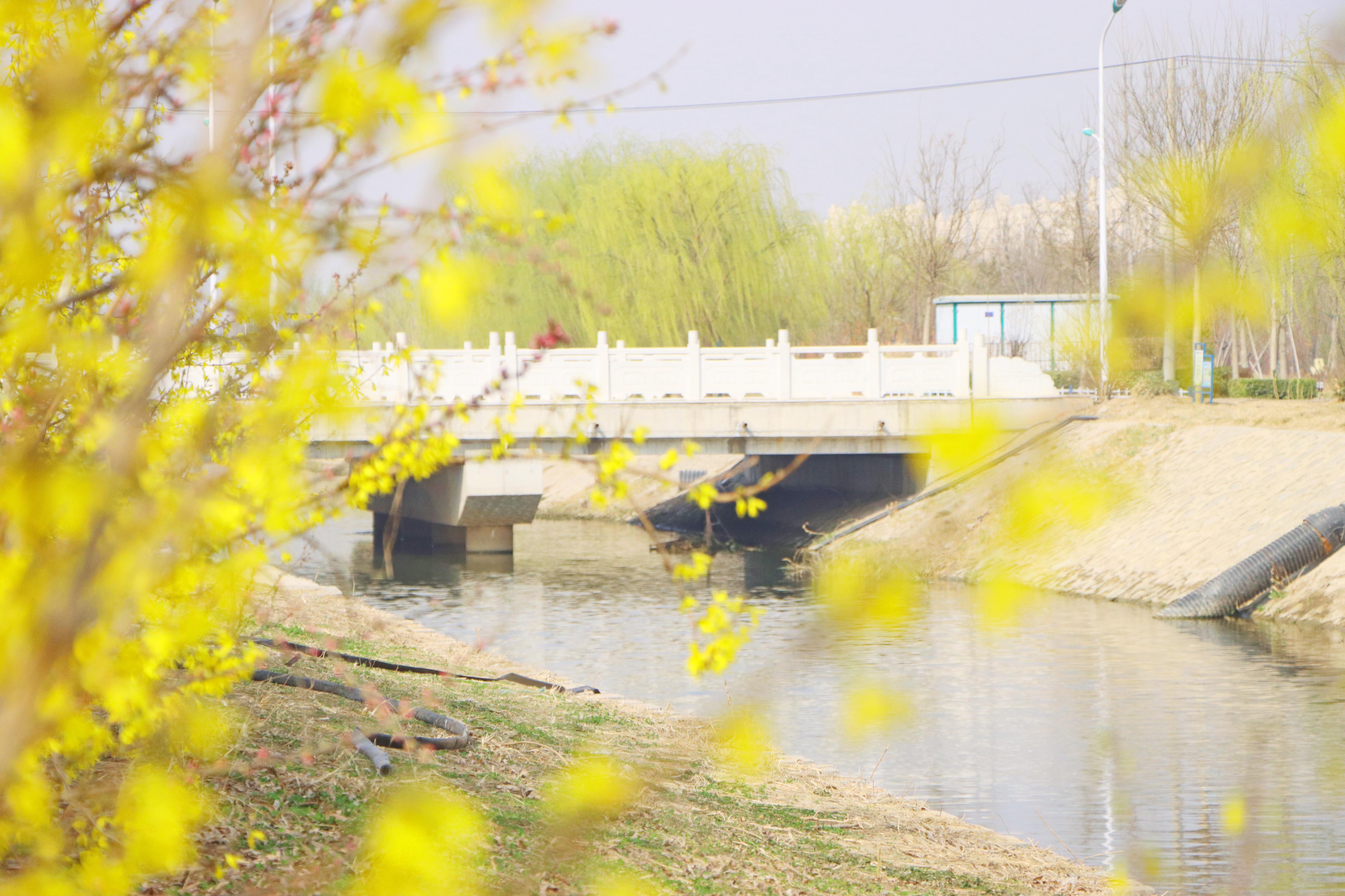 在怡水公园、创业公园、班曹店渠带状公园等地,栽植有白蜡、法桐等乔木,海棠、紫荆等灌木以及地被植物、水陆两生植物。迎春花、山桃花竞相开放……