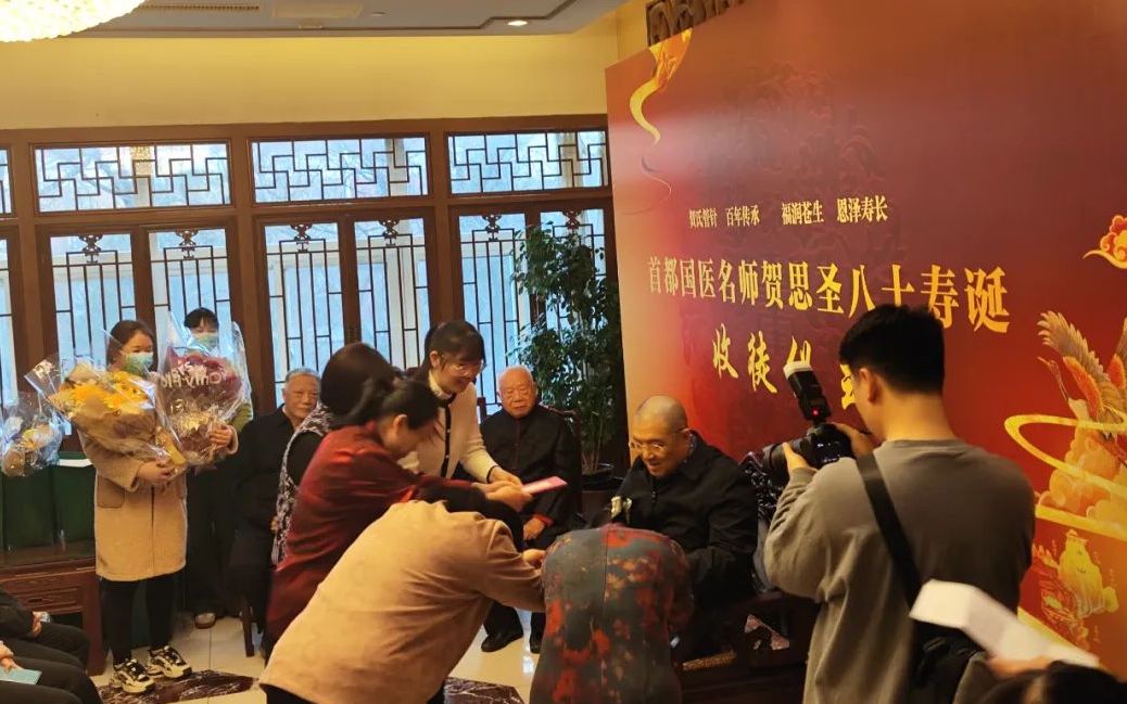 当天的拜师仪式简洁而庄重,按照拜师程序,周颖与其他4名弟子们向师父上拜师帖、敬茶、献花、行拜师礼,表达了对师傅的敬意和求学的诚意。首都国医名师在接受拜师帖后,回礼贺氏管针传承谱、印章,象征知识与责任的传递。在场的众多同仁见证了这一激励人心的时刻,并对周颖等中医师未来的学术发展和临床实践充满期待。