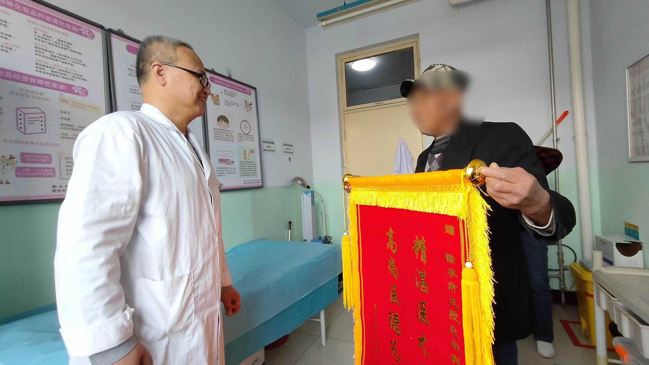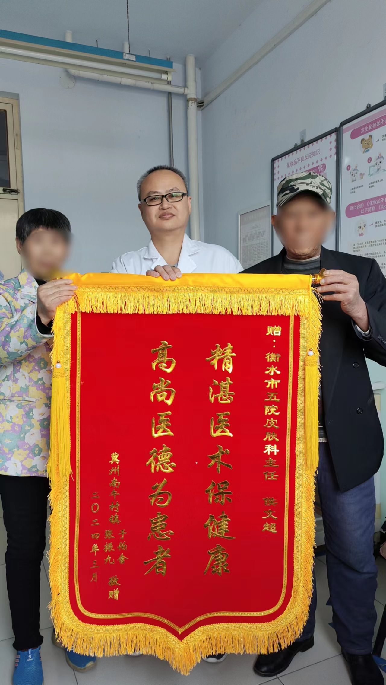 一个月前,《衡水晚报》05版刊登了一则《一位“红皮病”老年患者在衡水五院解除病痛》消息,3月23日,该患者与家属一起将一面锦旗亲手送到市五院皮肤科侯文超大夫的手中,表示感谢。