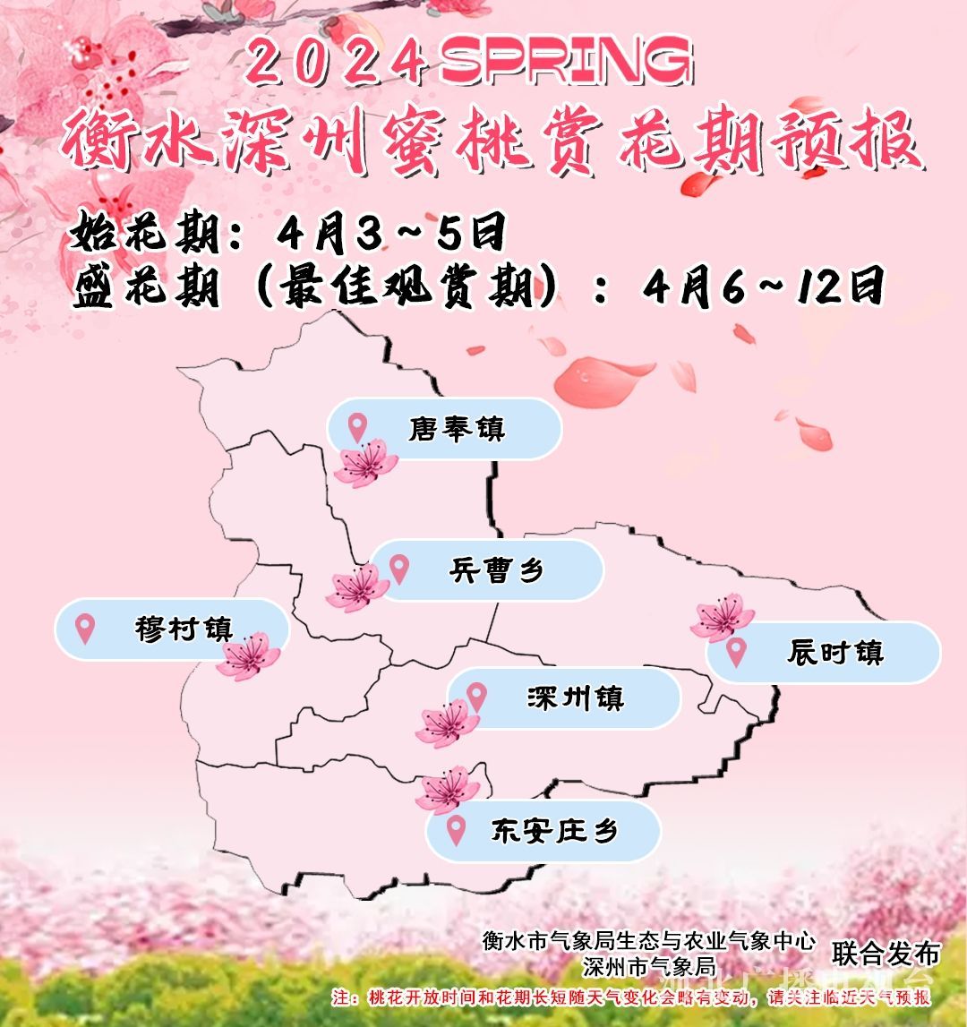 “桃花一簇开无主,可爱深红爱浅红?”近日,《2024衡水深州蜜桃赏花期预报》新鲜出炉。预计4月初,衡水深州市的桃花将陆续开放,邀请广大游客共赴一场粉色浪漫之约。据衡水市气象局生态与农业气象中心以及深州市气象局分析,结合桃树开花所需的气象条件,预计深州蜜桃始花期为4月3日到5日,盛花期即最佳观赏期为4月6日到12日。