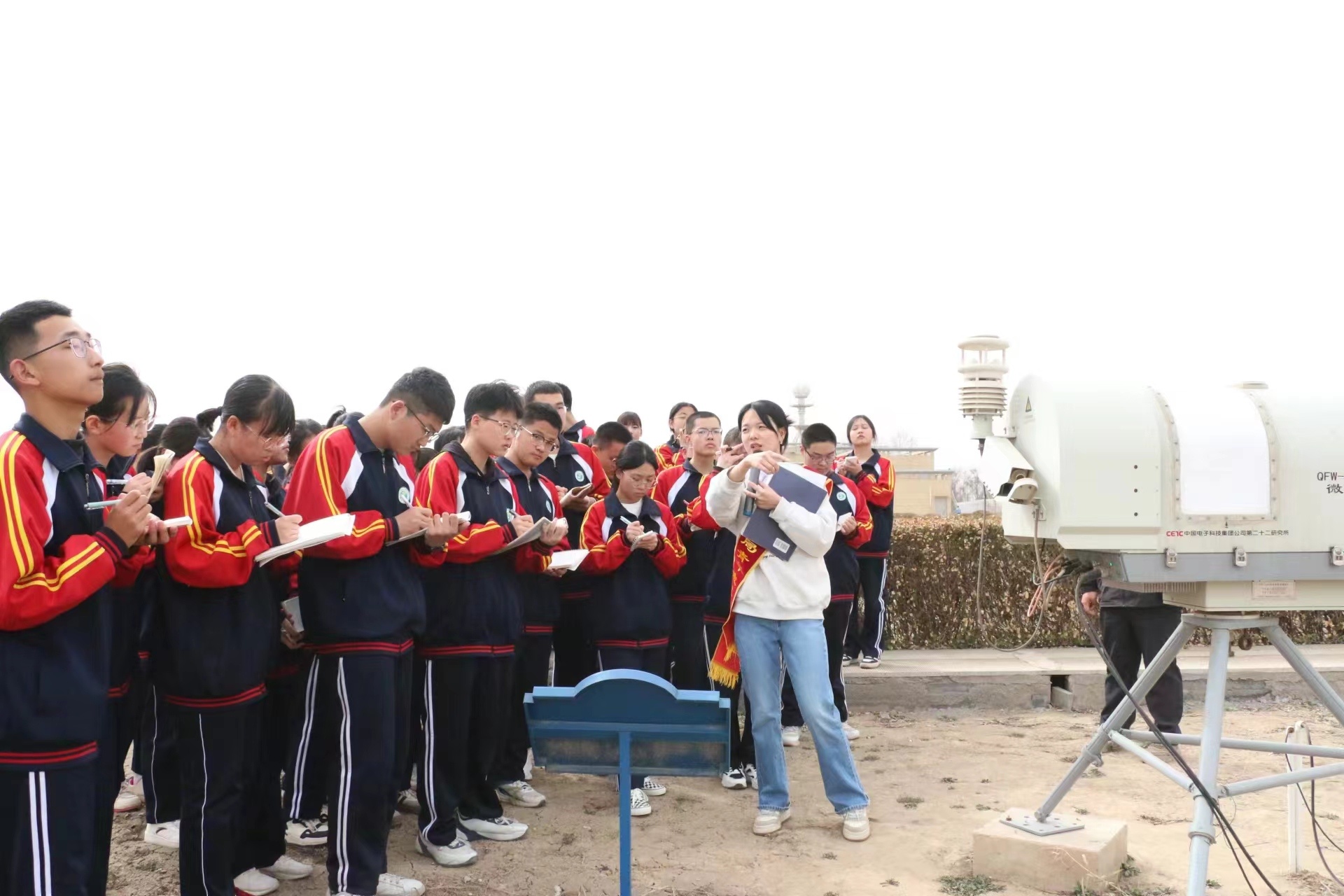 在观测场,工作人员为学生介绍气象仪器设备。饶阳县气象局供图