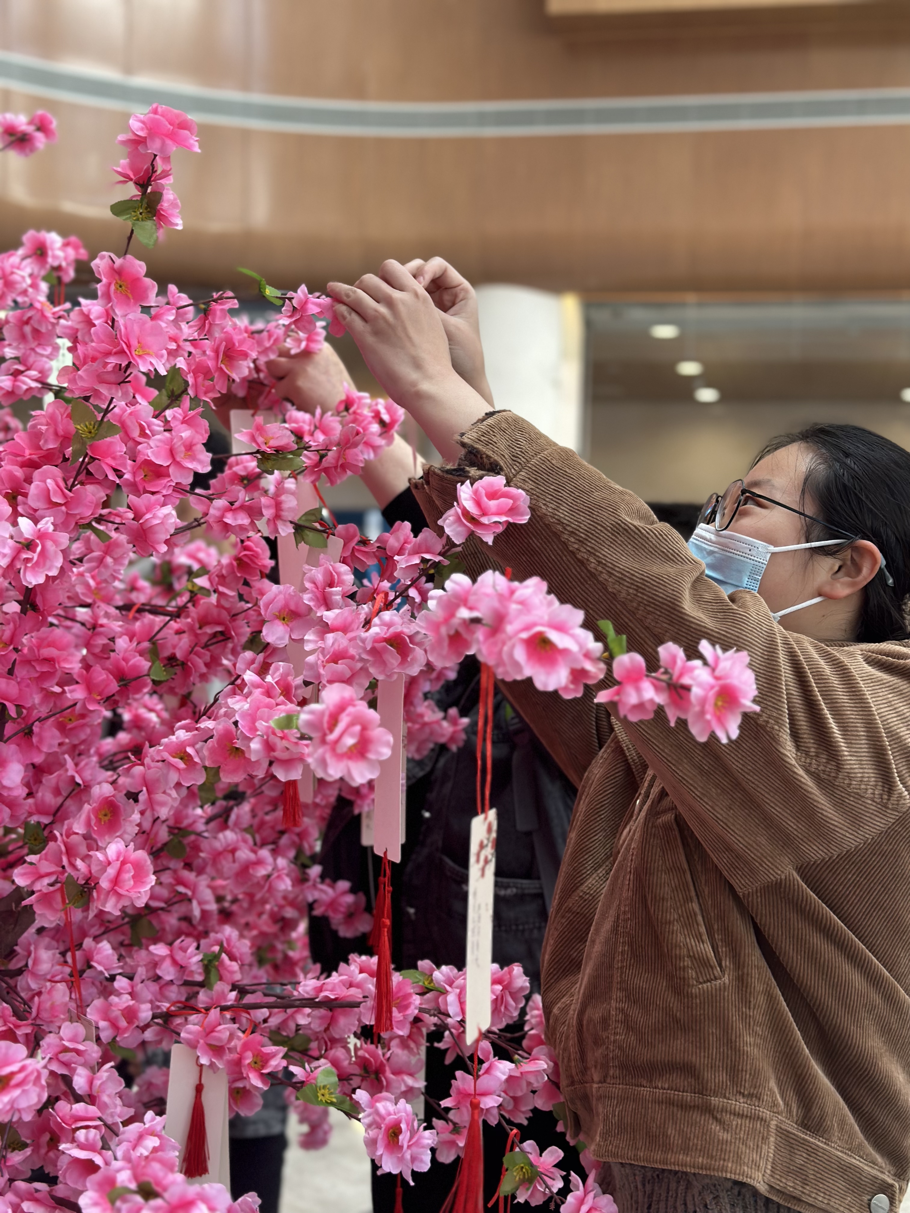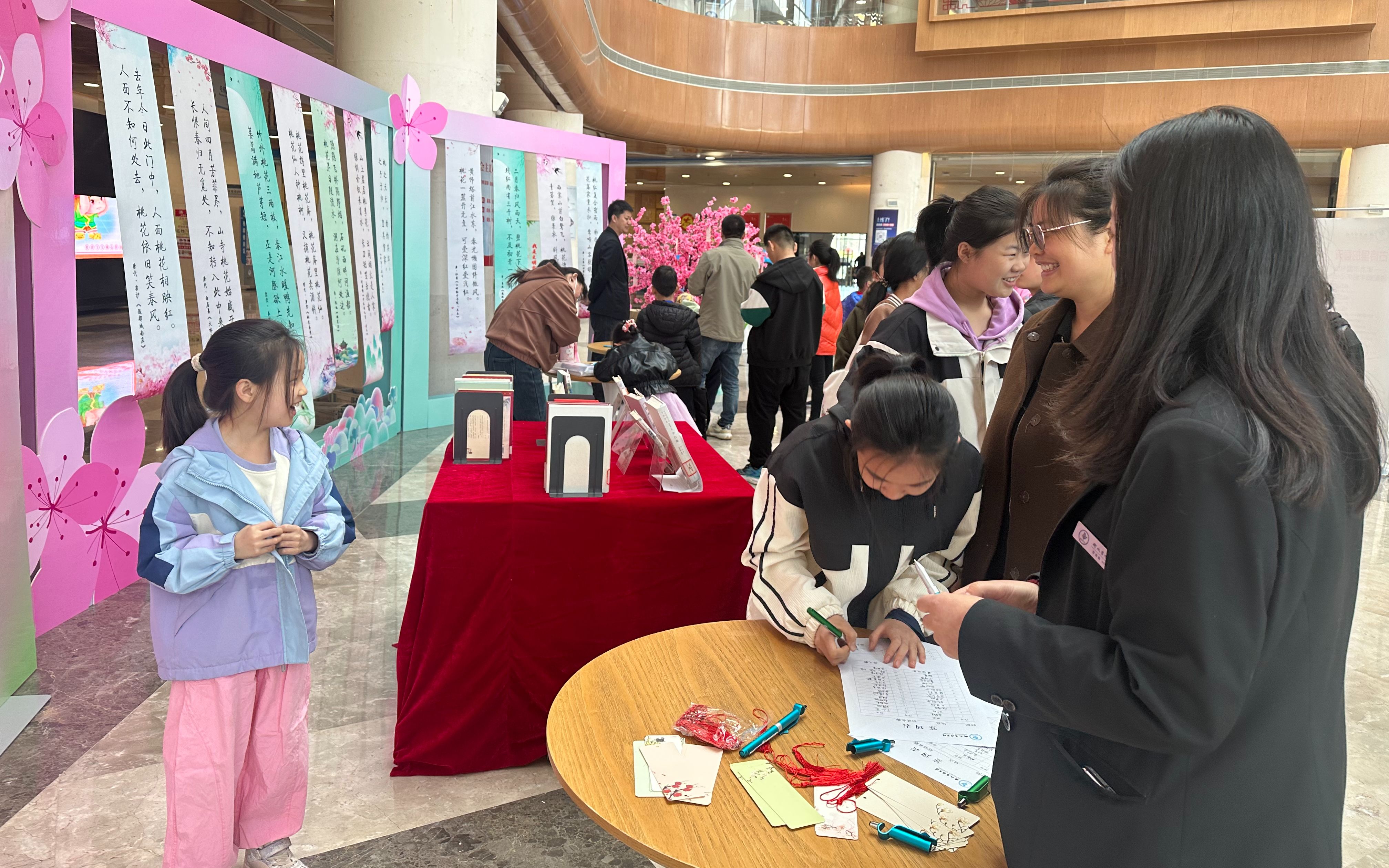 此次活动以桃花为背景,馆员为读者分发卡片,读者将自己抽取到的关键字与作答的诗句写到卡片上,并挂到桃花树上。“人间四月芳菲尽,山寺桃花始盛开……”一句句不同朝代的诗句纷至沓来,长长短短,或熟悉或生疏,此时读者们被这些诗词歌赋所吸引,热情高涨,诗意萦怀,不禁沉浸到一场精彩的诗词盛宴中。