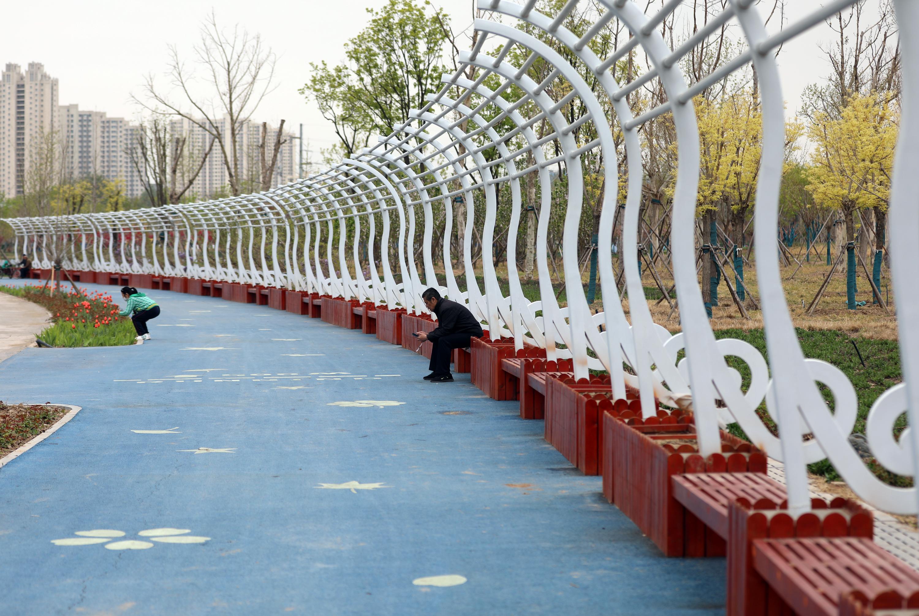 四月的湖城大地,繁花盛放,春意醉人。4月9日,市区奥体公园内正是一片烂漫花海,吸引了众多市民一边健身一边赏景,一副其乐融融的景象。