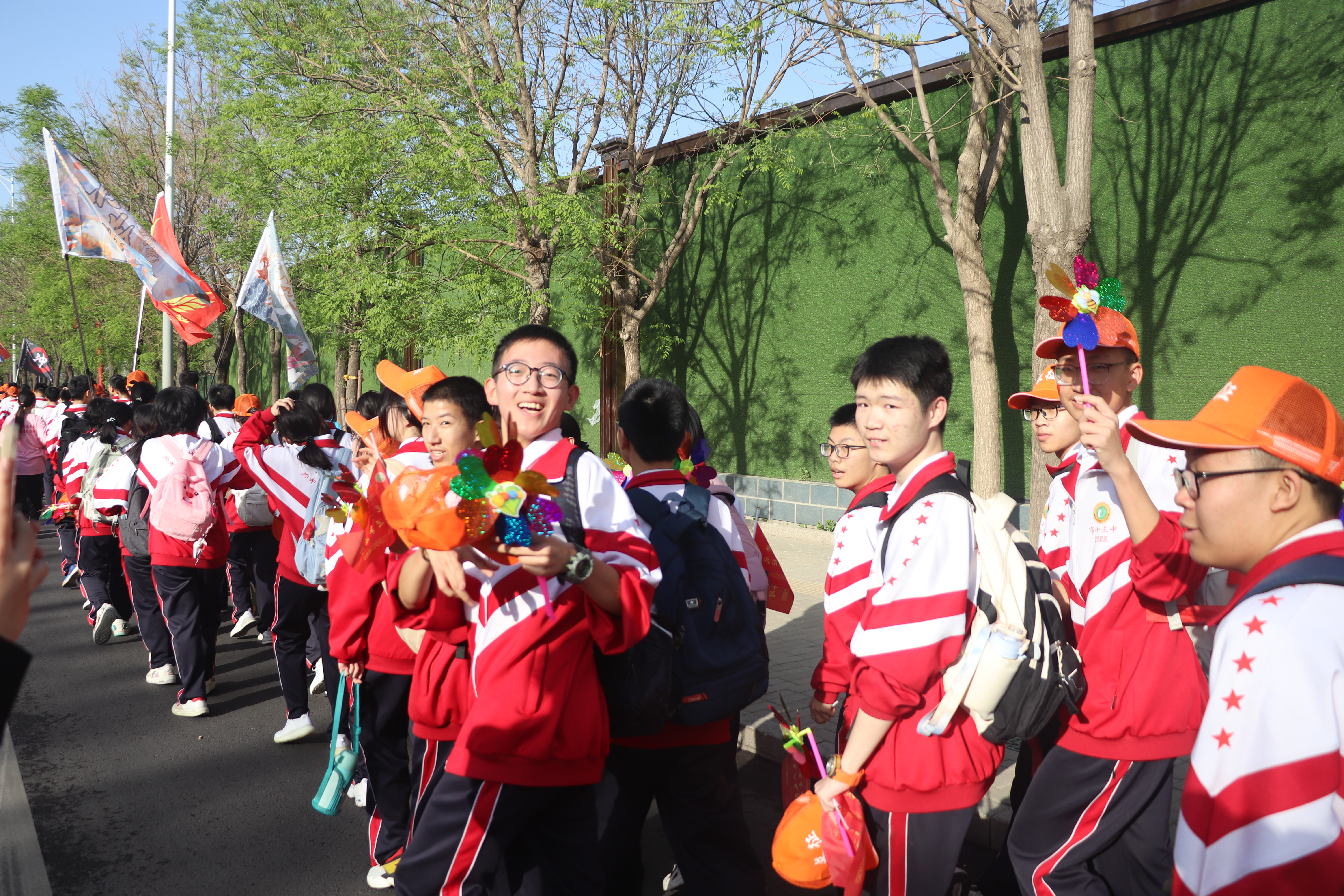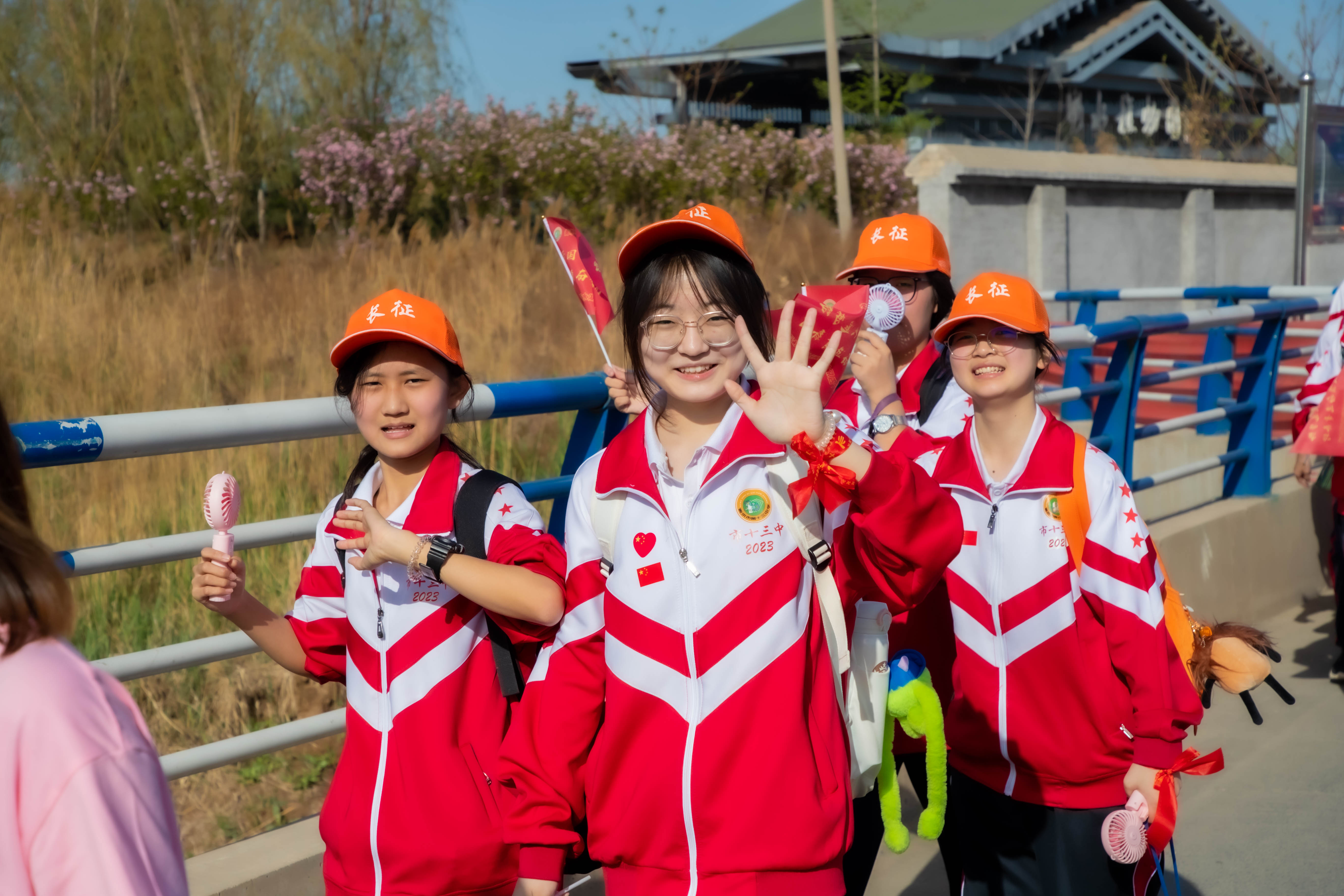 “出发!”6时50分,随着一声令下,学生们在老师的带领下,踏上征程。随着出征的号令,同学们迎着朝阳,意气风发踏上新征程。大家沿着规划好的路线行进,队伍整齐,步伐坚定。走过学校的“出征门”,学生们斗志昂扬。早早等候在这里的家长有的敲锣打鼓,有的挥舞着小红旗和孩子们互动,有的拿着摄像机记录学生的每一个瞬间。“全力以赴、不负今朝;扬帆起舵、奋勇拼搏……”一声声鼓励坚定着孩子们前进的脚步。一路上,同学们欣赏着春日的自然风光,呼吸着清新的空气,感受着大自然的魅力,他们时而欢声笑语,时而口号响亮,焕发着十三中学子靓丽飞扬的青春光彩。